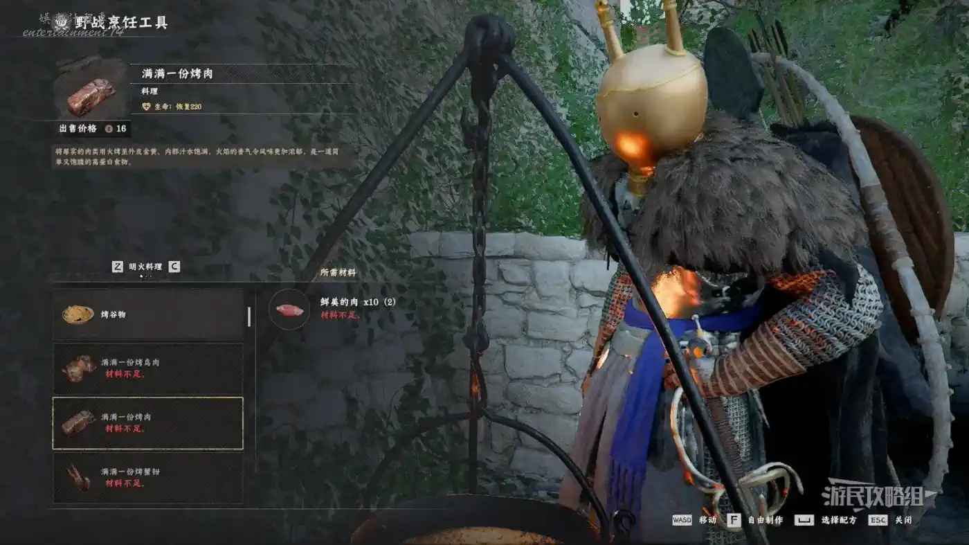 在埃爾南德肉鋪右側可以看到烹飪鍋。按L1/LB瞄準鍋,按下【烹飪】對應按鍵,然後選擇烤肉(恢復80生命值的那個),點擊製作並選擇最大數量即可,然後對背包中所有類型的生肉都重複此操作,就能獲得大量的烤肉了。