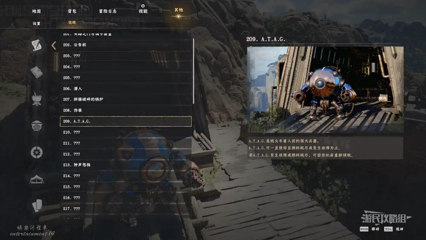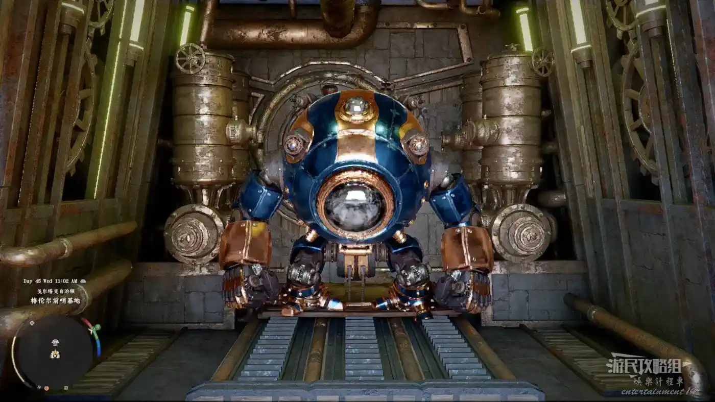 機甲指的是【嘟嘟鳥小型A.T.A.G】,需要將主線任務推進至第10章【反擊-殺手鐧】才能解鎖(只推主線不做支線不探索的話,大約需要50~60小時)。此機甲有多個衍生版本,其中部分版本還配備有火箭拳、導彈發射器、火焰噴射器和噴氣背包。進入機甲前可以通過查看Mk狀態來了解具體版本。想要使用機甲,只需靠近並互動就會出現大量操作選項,包括速射炮、加農炮、電磁脈衝等。