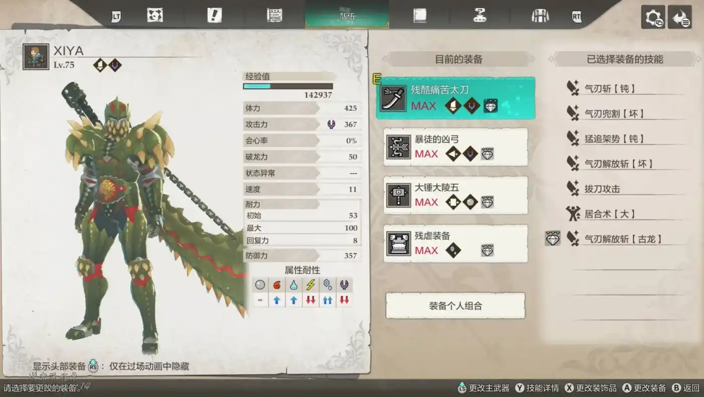 裝備選擇:絲瓜套(如果升級滿了插雷屬性攻擊強化珠)+飛雷龍太刀/紅怪龍太刀(插氣刃牙獸珠)+紅怪龍大錘(插精準打擊鈍)+紅怪龍銃槍(插挑釁)