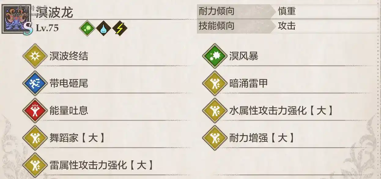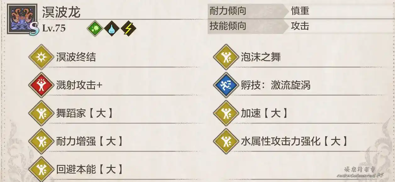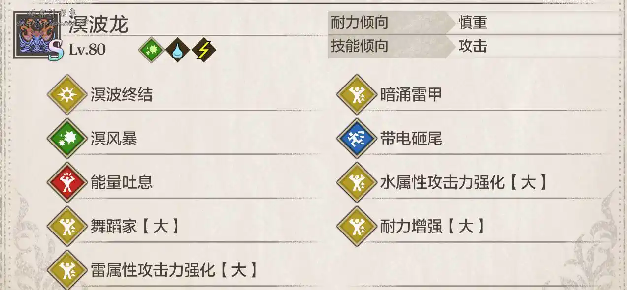 溟波龍有三種狀態:水纏身(技巧,弱火)、溟波帶電(速度,弱火)、水枯竭/封龍(力量/弱無屬性)