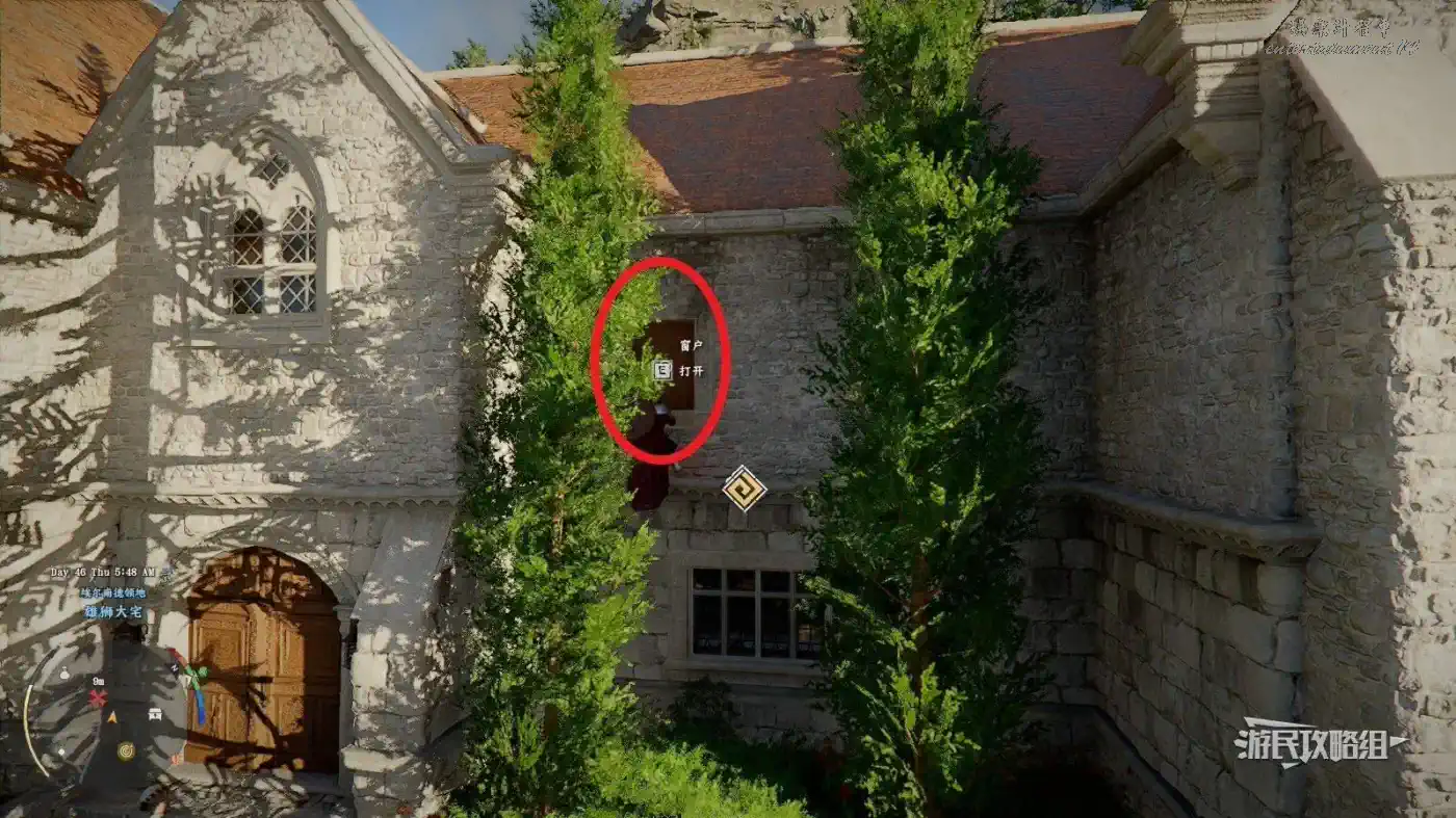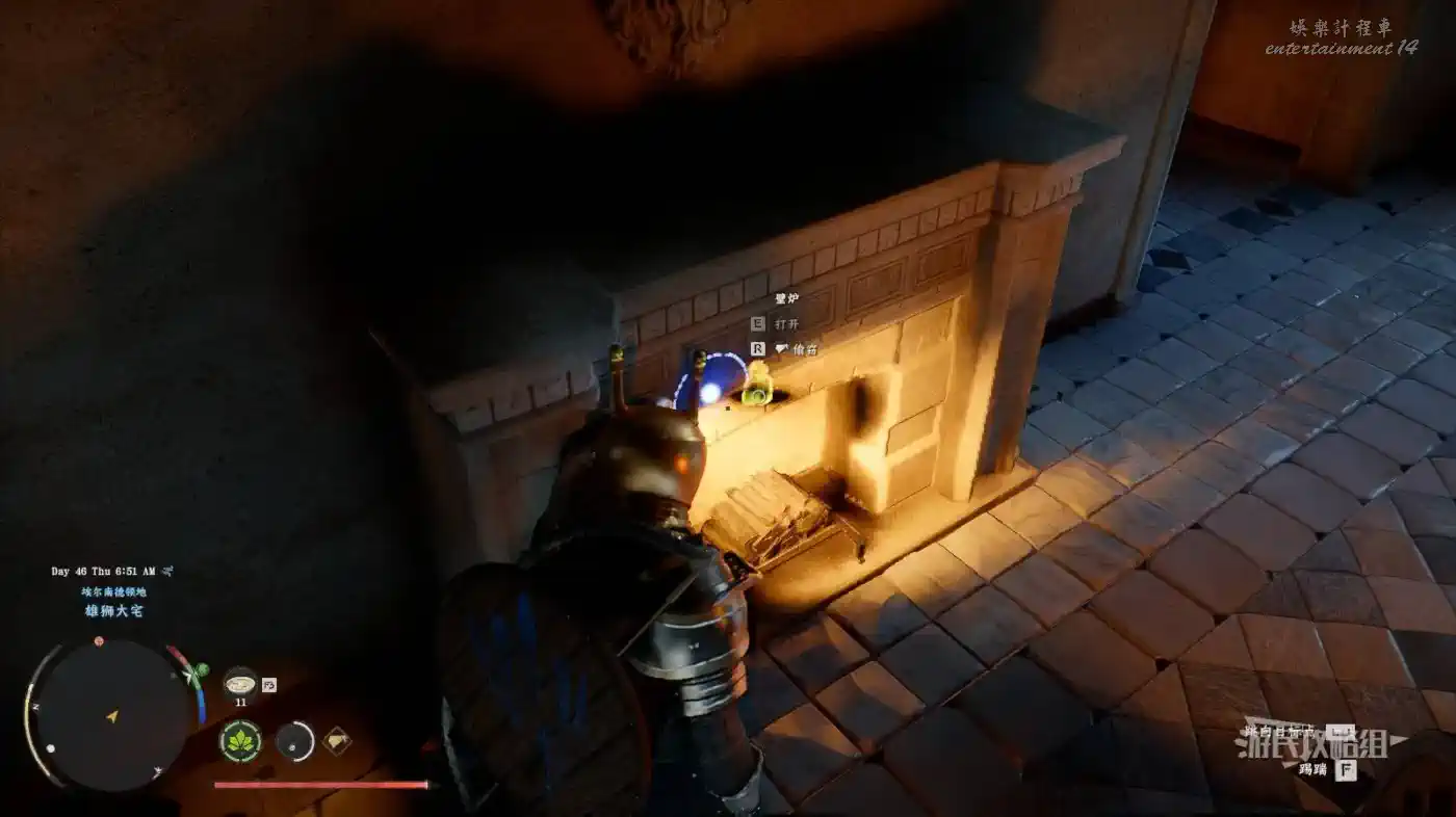 宅邸每個門口都有守衛,不接支線不能走門進入宅邸,這裡直接翻窗進入二樓,從二樓回到一樓,在主入口對面的壁爐裡,戴上面罩,熄滅爐火,按住Ctrl/L1查看壁爐,出現偷竊的提示後按互動鍵偷竊即可獲得一根金塊(金條)。