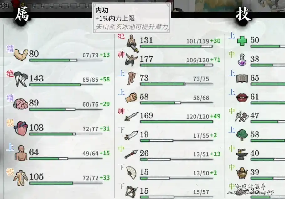 基礎屬性:內力上限、生命上限、護體真氣、內力恢復、防禦、抗性。