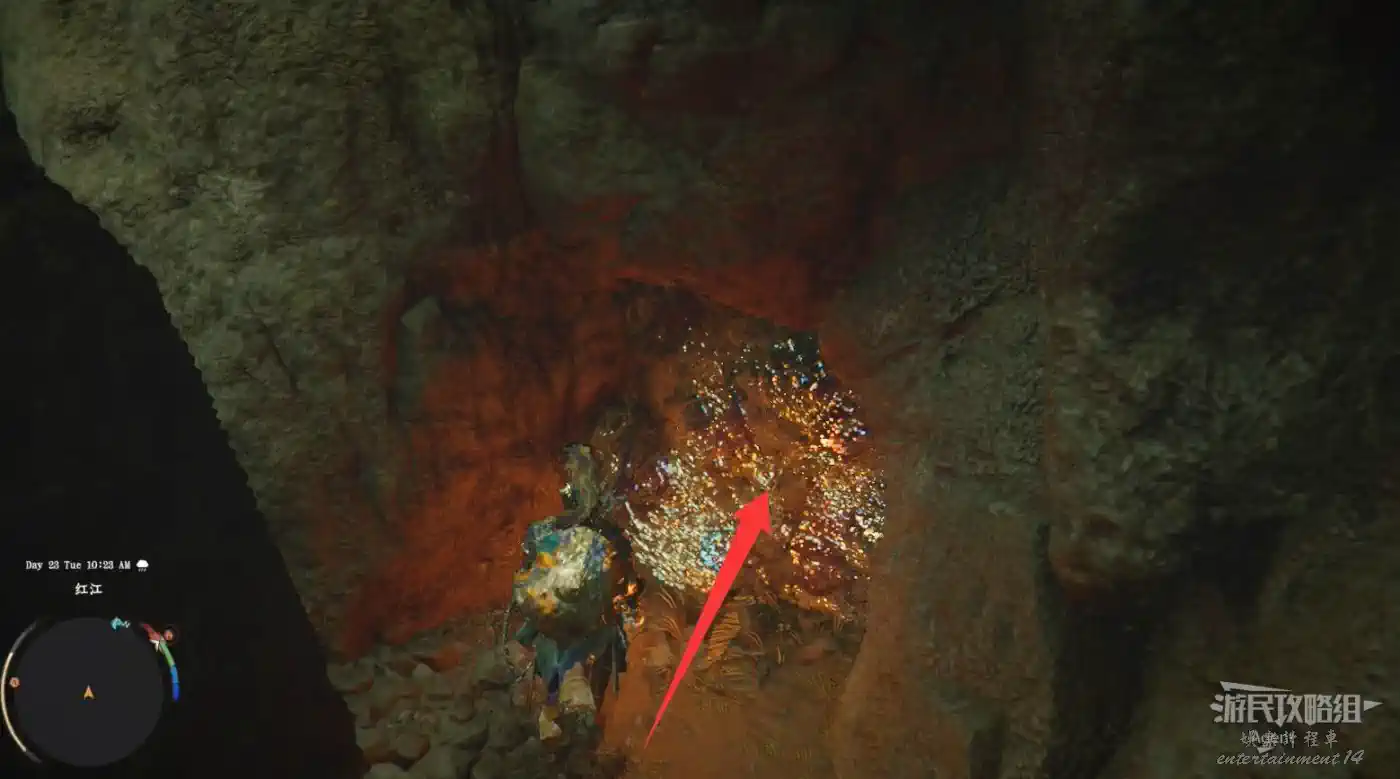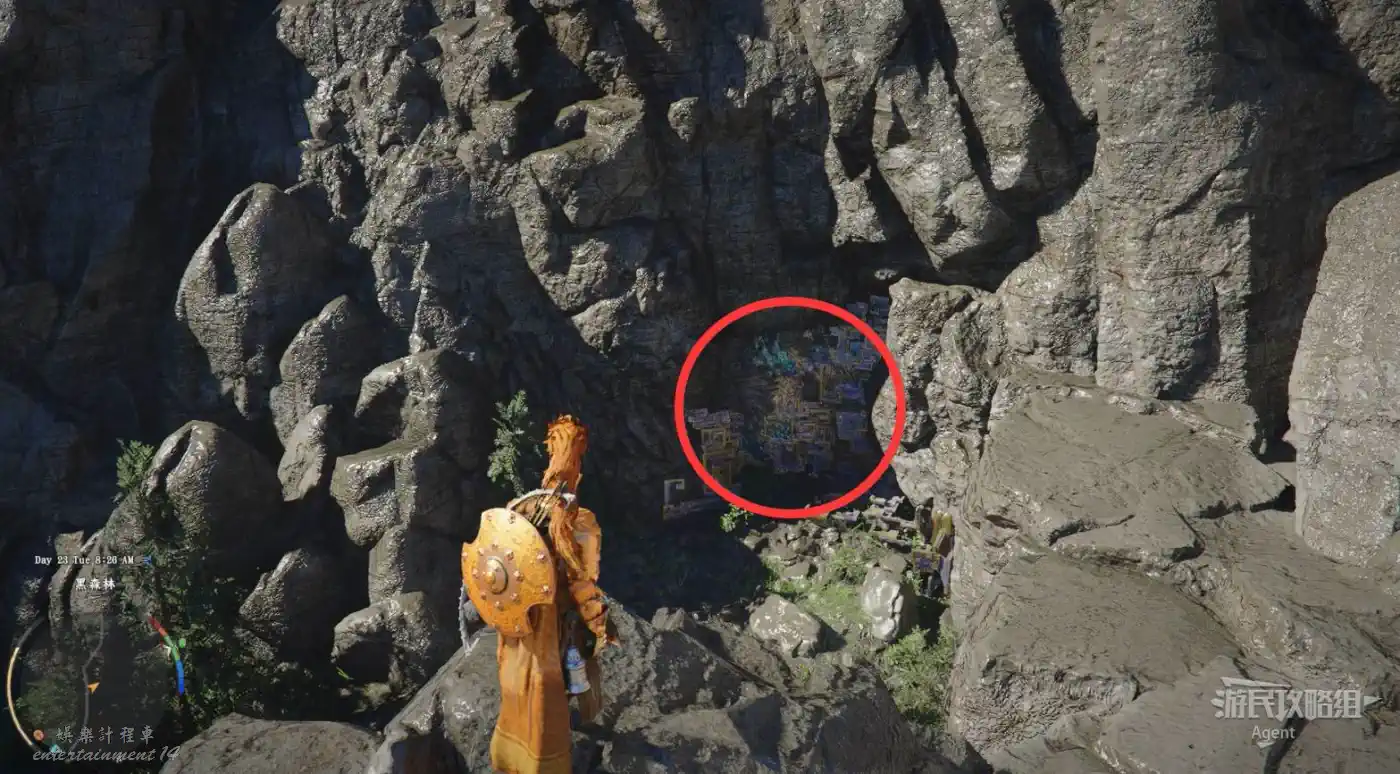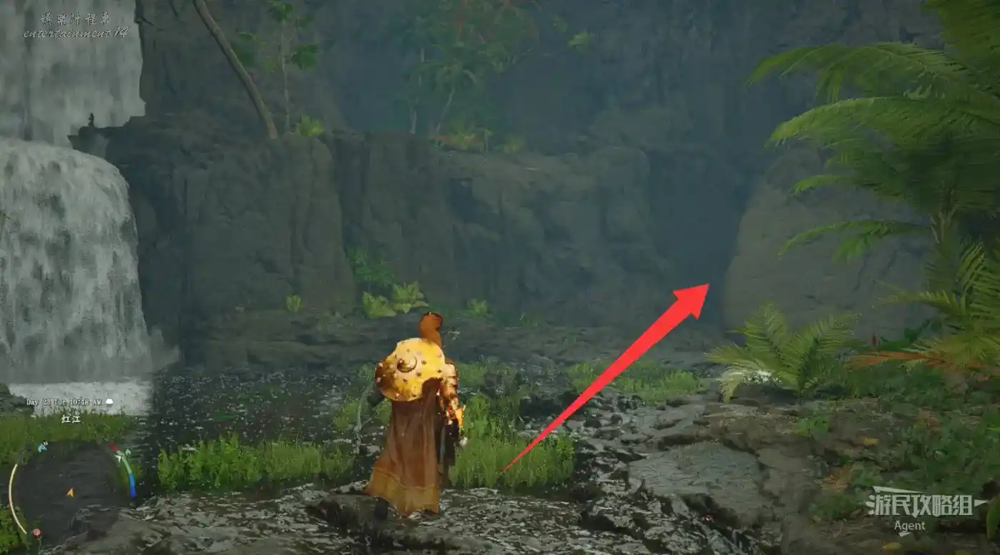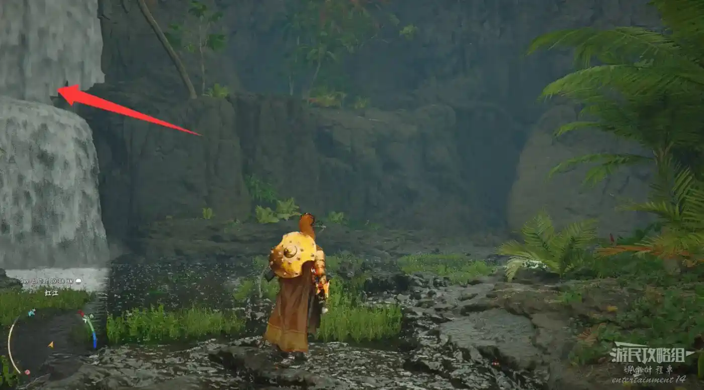 瀑布右邊有個大石塊,進入縫隙到石塊後面,用技能“勁法:凝神”打碎彩色石頭,進去開寶箱拿到【金色慾望板金鞋子】。