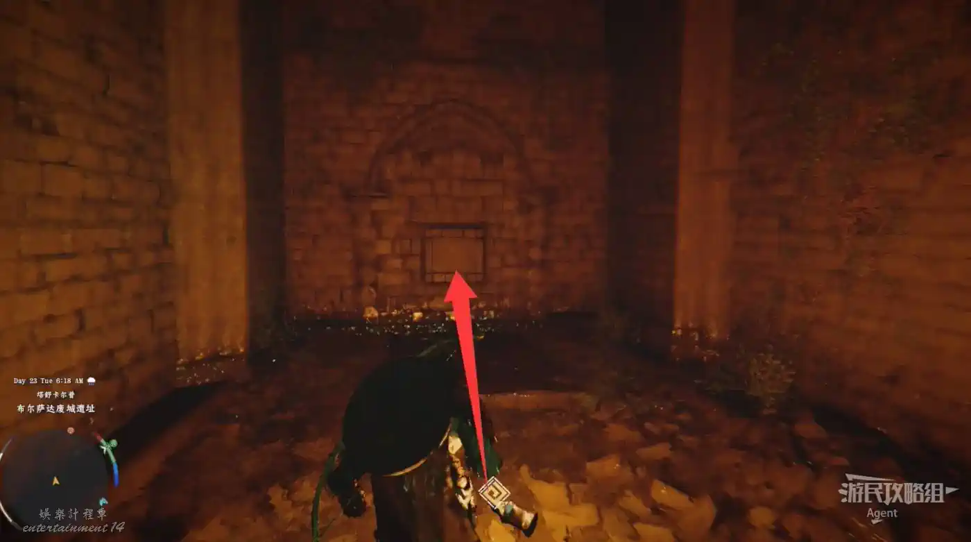 下圖位置有個階梯,進入階梯旁的洞,站在牆上的機關前,對牆上的機關使用勁法可穿過牆壁到裡面的隱藏空間,開寶箱拿到【金色慾望板金盔甲】。