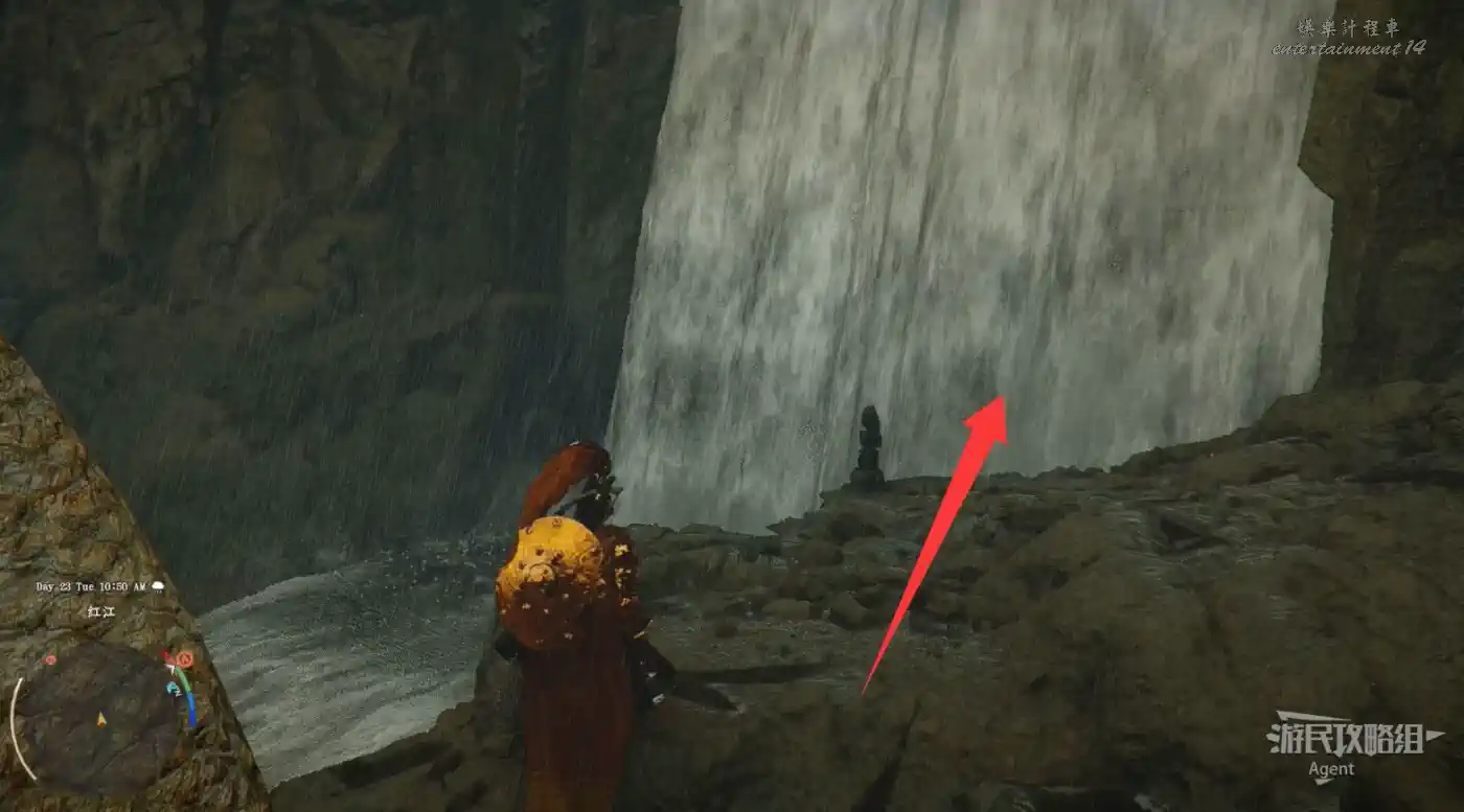 從瀑布中間的左側平台,用刺擊穿過瀑布進入瀑布後面的洞穴,開寶箱拿到【金色慾望板金手套】。