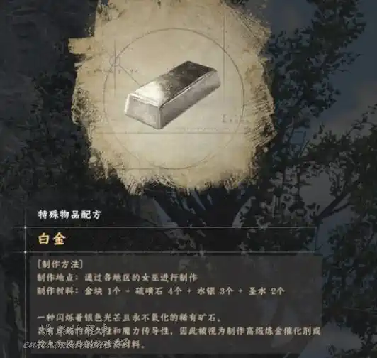 白金可用於古神武器製作、研究院刷好感(迴圈獲取水銀/硫磺/橡膠)。