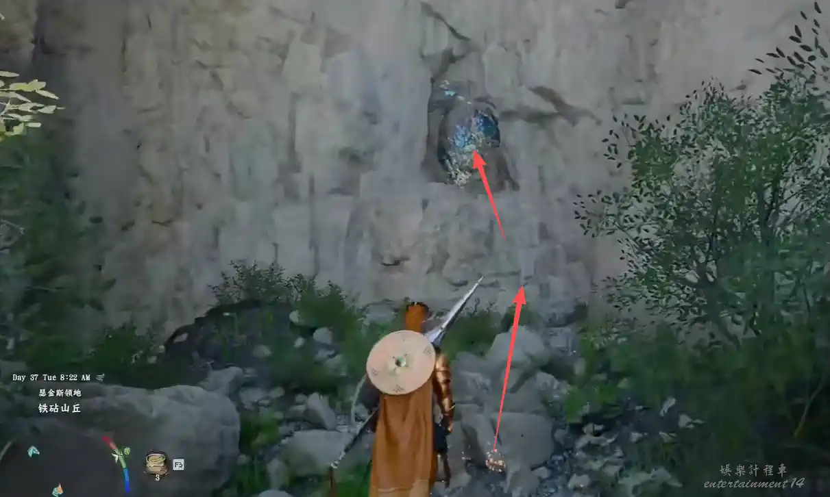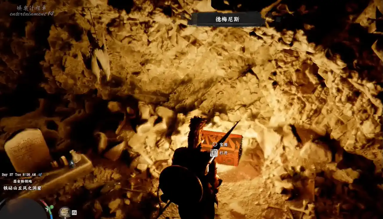 赤血沙漠 (Crimson Desert) 被詛咒的靈魂板金手套獲得方法 27 3 月 2026-03-27 廣告 來源:互聯網 一、位置定位 區域:德梅尼斯(DEM)西方 → 瑟金斯領地「鐵砧山丘」 具體地點:鐵砧山丘岩壁後的「風之洞窟」內 二、詳細獲取步驟 從德梅尼斯城向西出發,前往瑟金斯領地的鐵砧山丘 找到岩壁上的藍色發光洞口(圖中箭頭指向位置) 攀爬至岩壁洞口,進入洞窟後,在石質通道內找到紅色寶箱 打開寶箱即可獲得被詛咒的靈魂板金手套,同時還能獲得止靜丹等道具