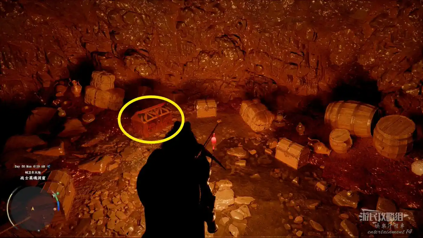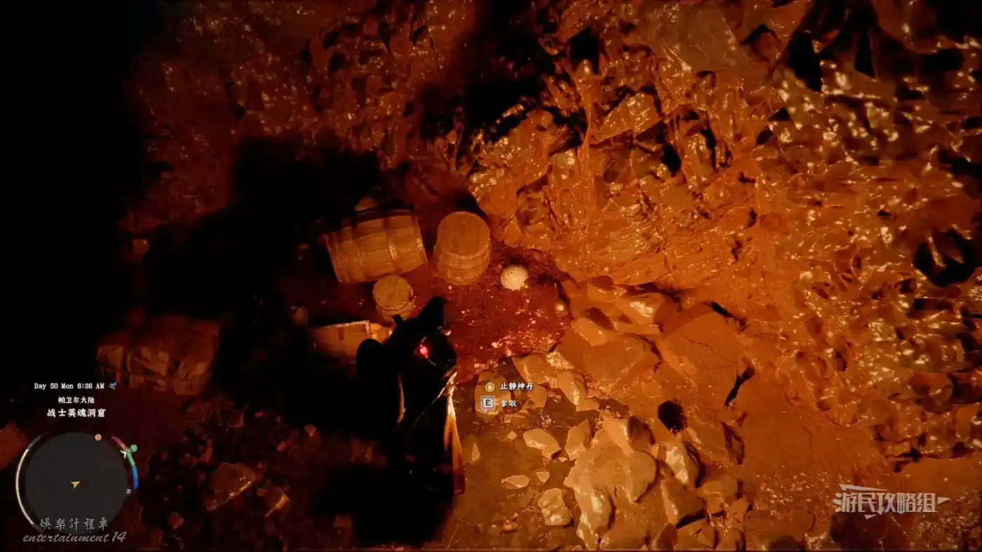 可以從地圖上的DRYWIND VALLEY往北走到達河流所在位置,沿著河流走到瀑布後,飛到瀑布底部,用刺擊穿過瀑布,沿著唯一的路往前走即可進入【戰士英魂洞窟】,此披風就在洞窟盡頭的寶箱中。另外,旁邊還有一顆【止靜神丹(滿血復活藥)】,還有一些銅幣寶箱和賣金道具。