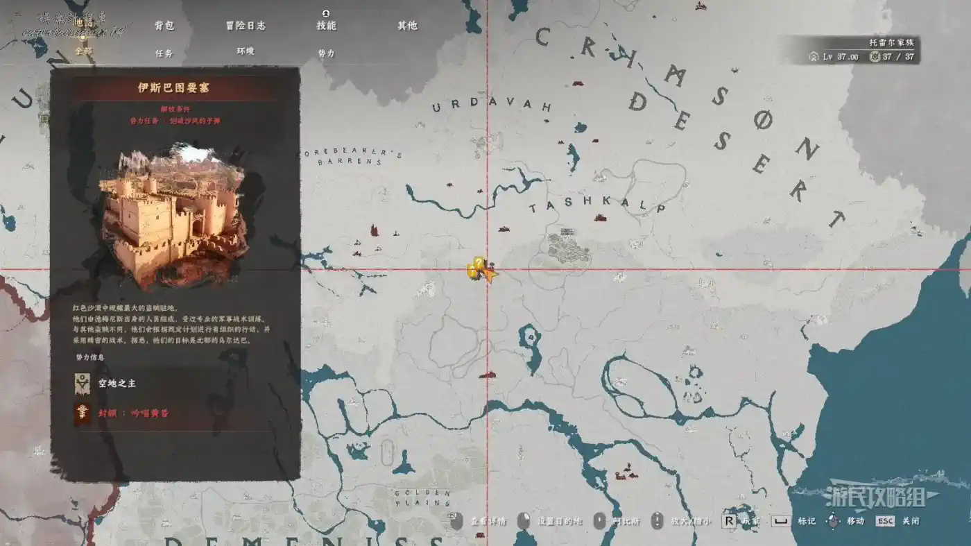 BOSS沙漠守衛薩瑪拉位於地圖上紅色沙漠地區塔什卡爾普(地圖上的TASHKALP左下方)的【伊斯巴圖要塞】,周圍有許多敵人,但直接飛進要塞內的中間空地就能觸發BOSS戰了(目前版本可能有BUG,進去後需要擊殺一些敵人才能觸發BOSS戰)。