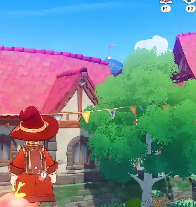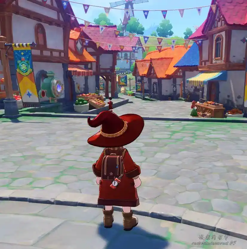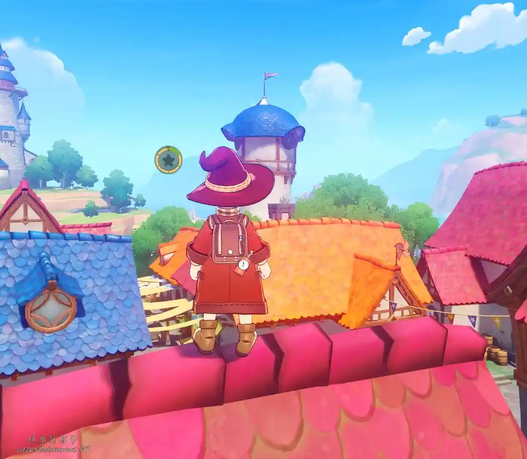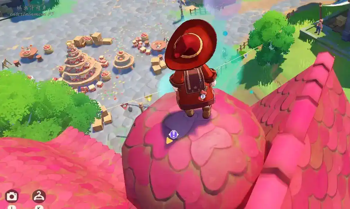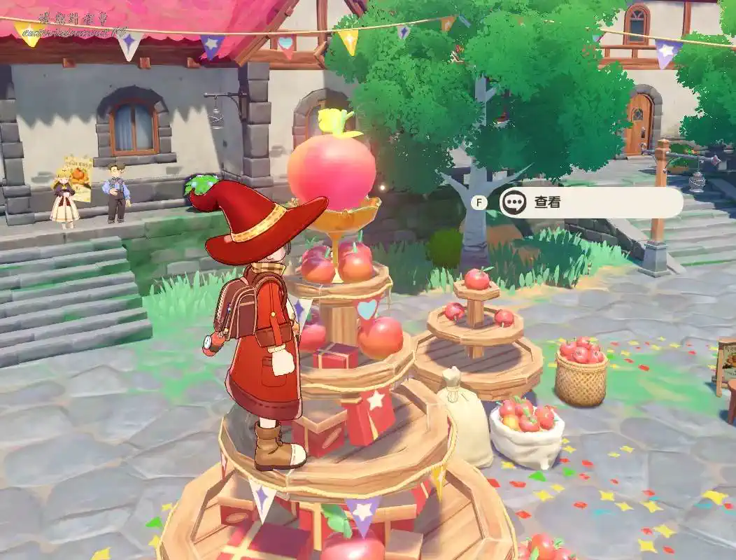之後回到廣場的告示牌那裡,直接飛過告示牌背後的房子,會看到擺滿可哥果的廣場,來到中間最高的那一堆可哥果那裡,最上面的就是可哥果之王,那裡有個紙條,點擊紙條可以得到下一步的線索,讓你找競技場旁邊的藍色高塔。