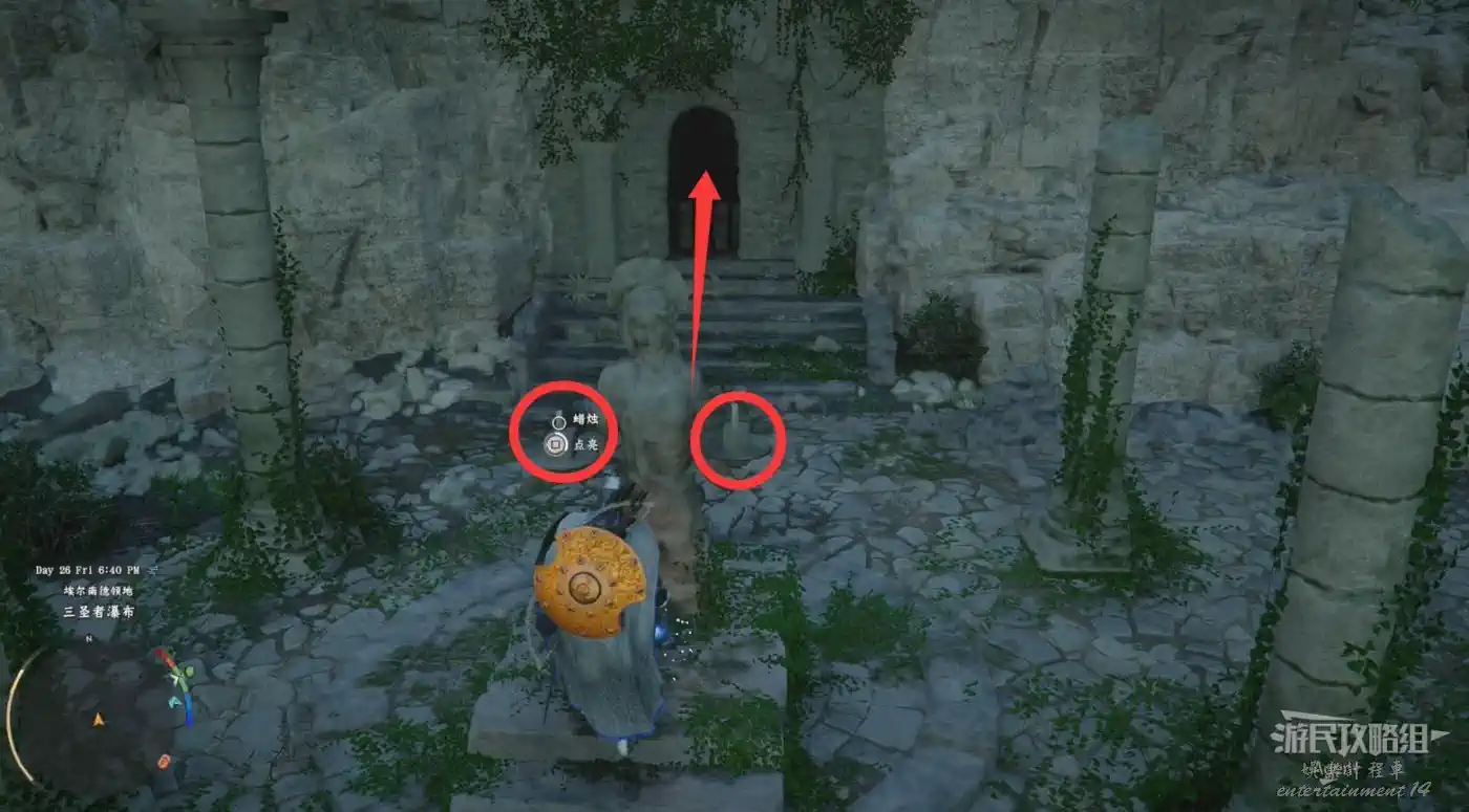 進洞擊敗怪物,點燃門口的兩個燈籠,開門拿到【巫師法杖】。