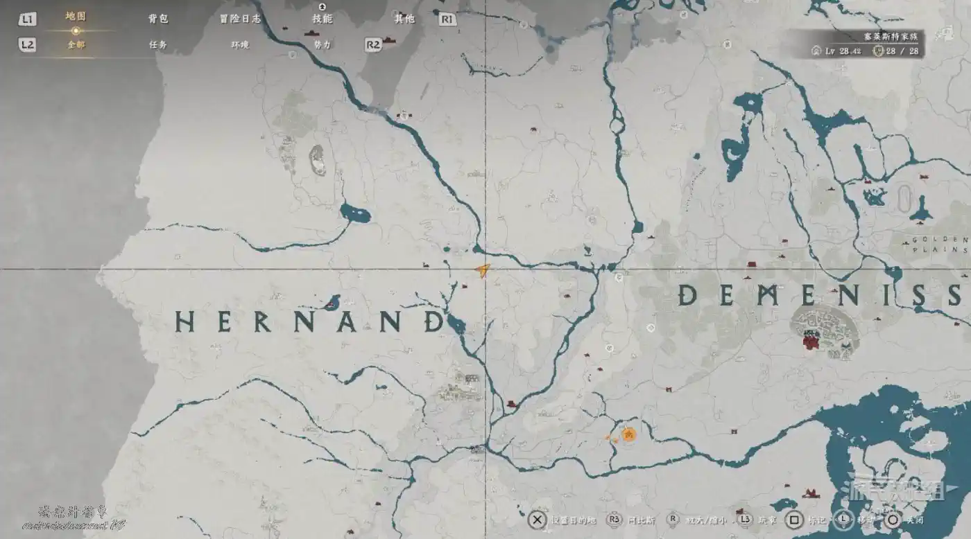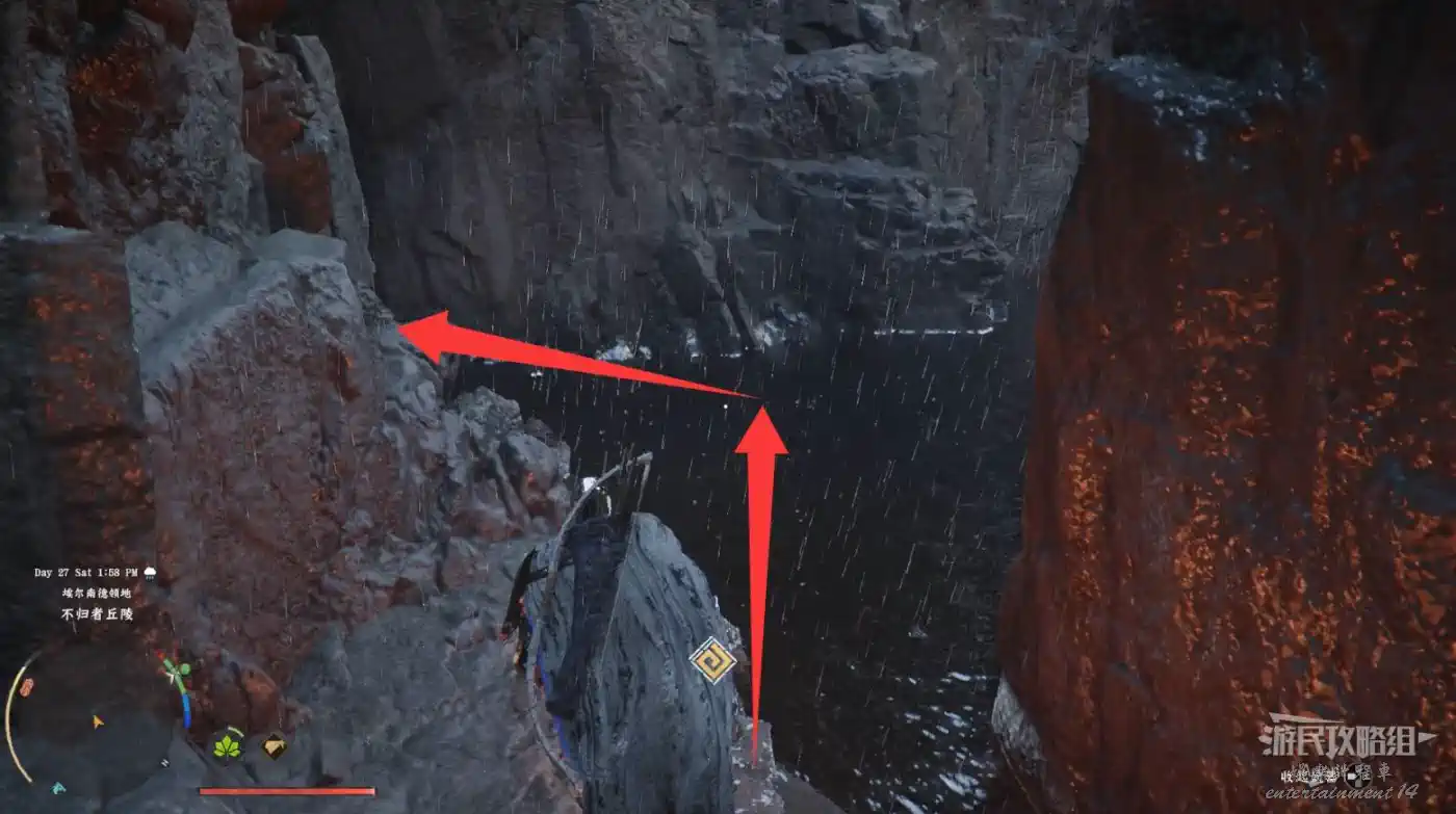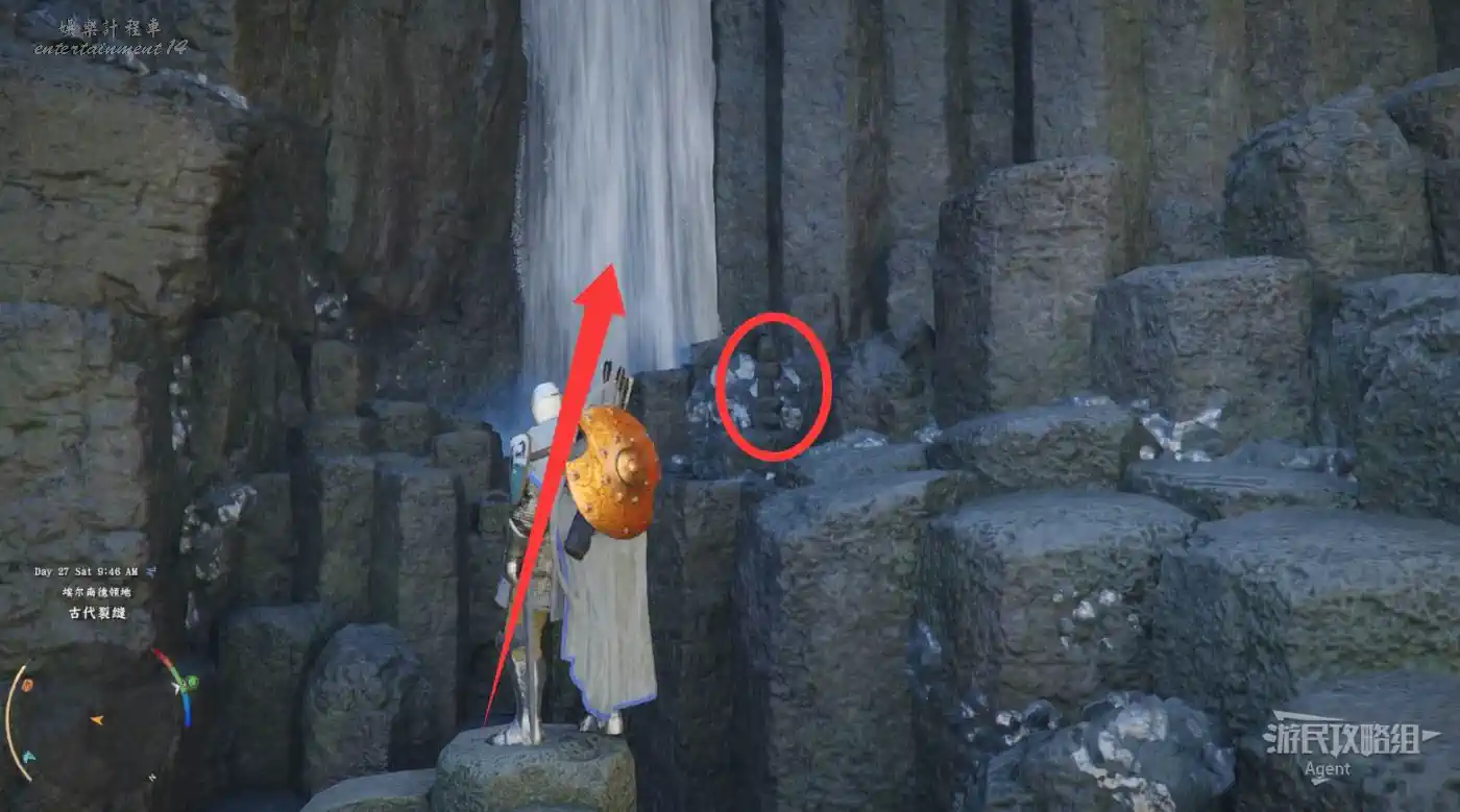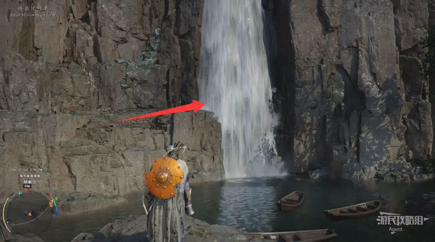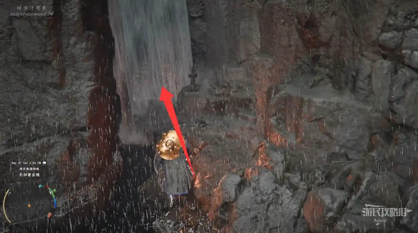 在埃爾南德東面,下圖位置有兩個瀑布,跳到下面,用刺擊進入右邊瀑布後面的洞窟,開寶箱拿到【焦灼火焰板金手套】。