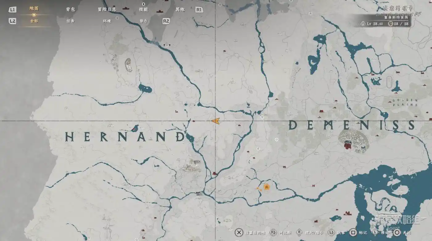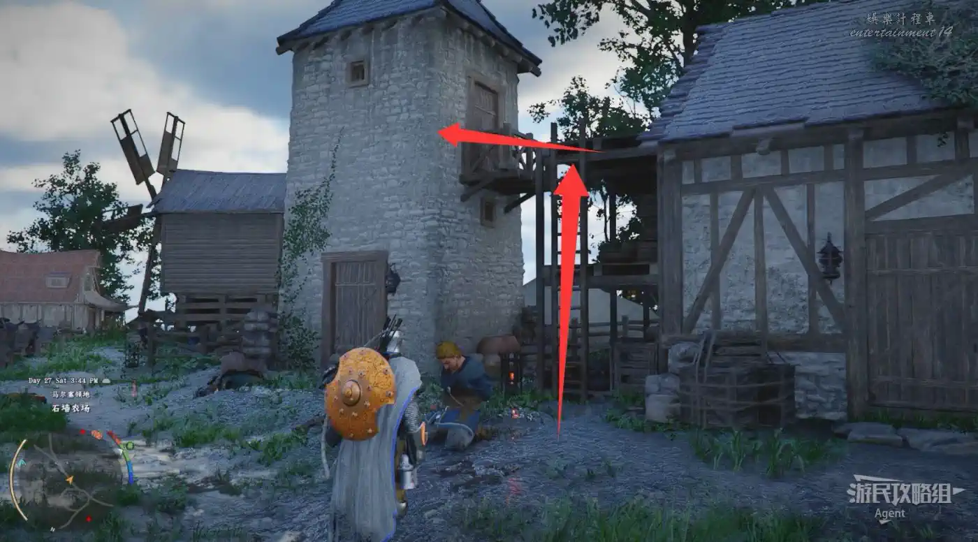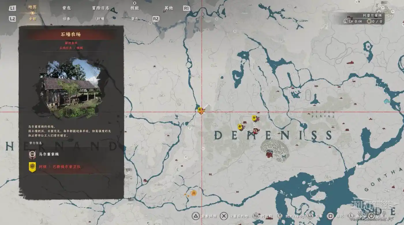 在埃爾南德東面(德梅尼斯附近),石牆農場下圖位置的穀倉裡,爬到上面開門(慢點進門,掉下去得重新爬),拿到寶箱裡的【焦灼火焰板金頭盔】。