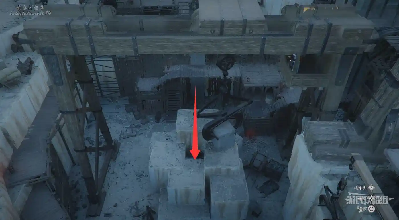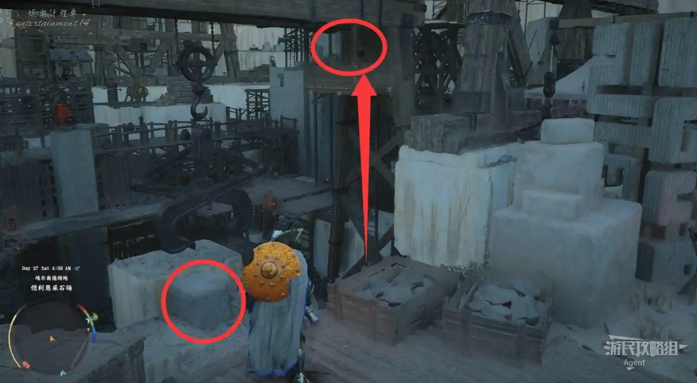 爬上小型採石機旁的梯子上去操作臺,操作小型採石機搬開立方體石塊,然後到下面洞裡開寶箱拿到【免子皮制面具】。
