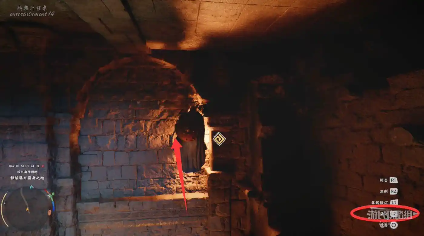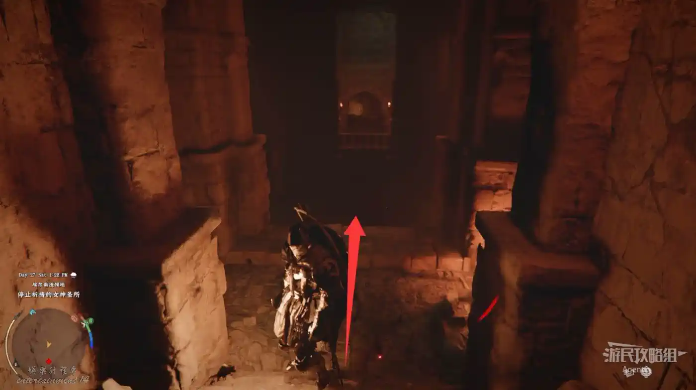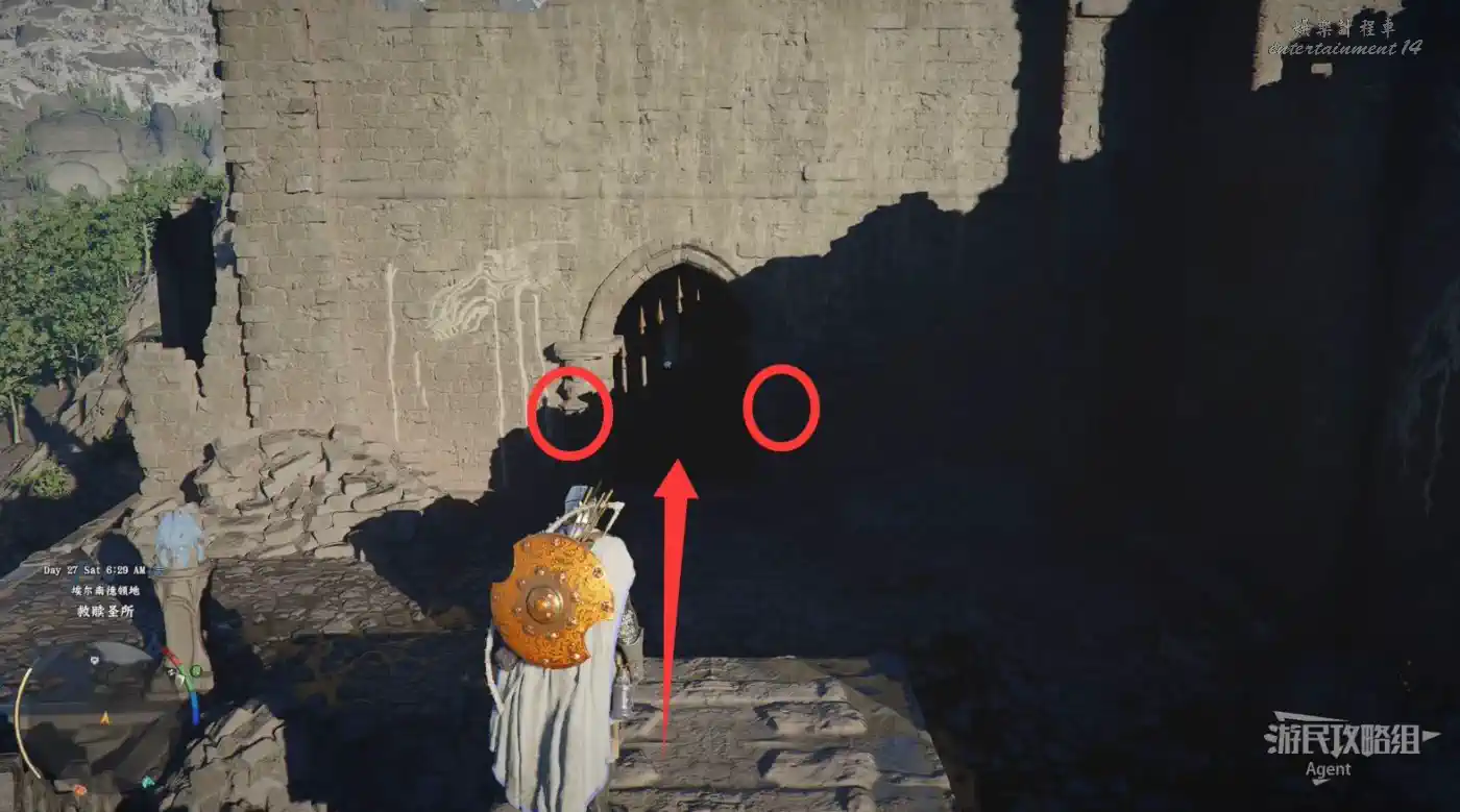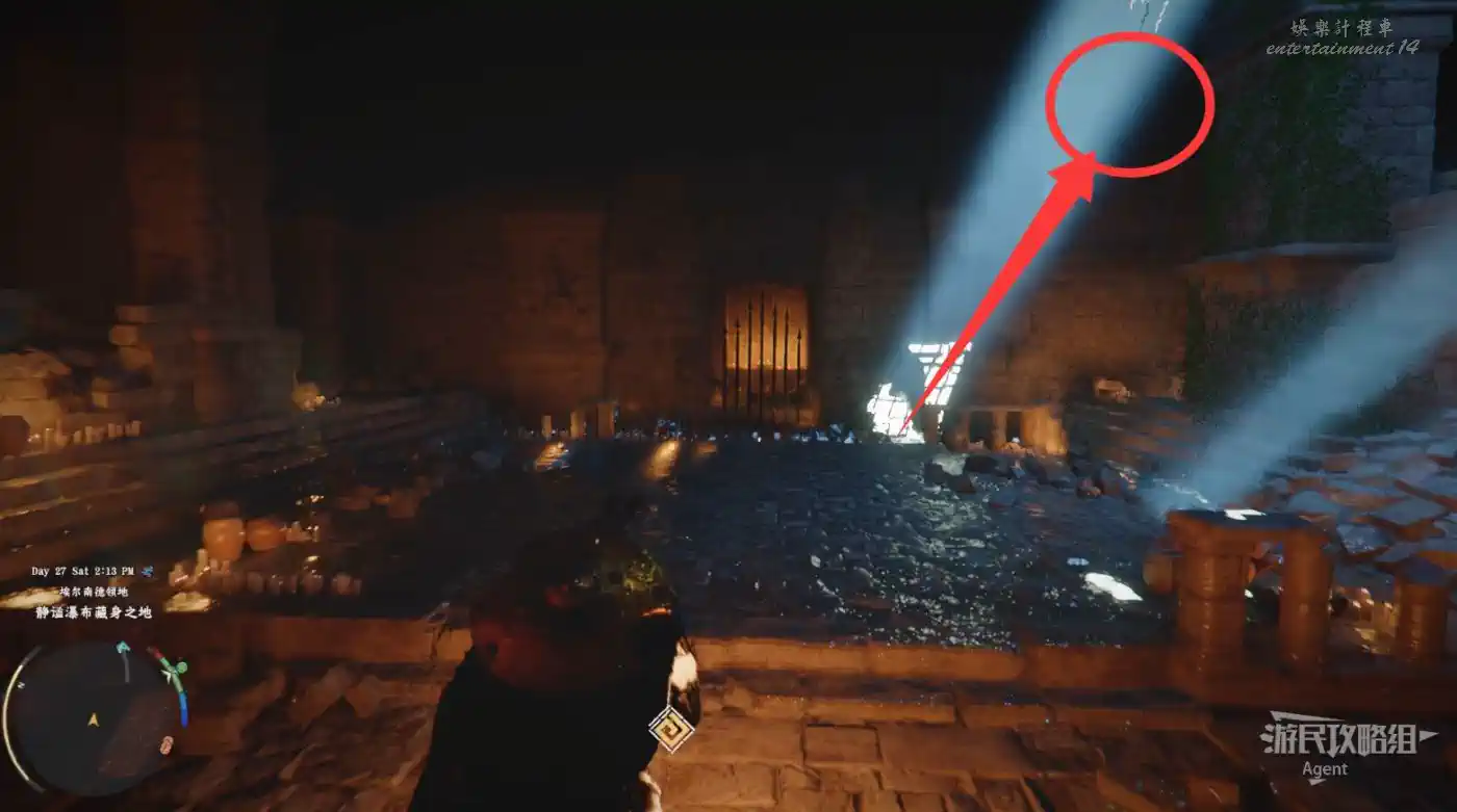 在埃爾南德下圖位置,點燃門口的兩個燈籠,開門進去拿到寶箱裡的【狼王頭盔】。