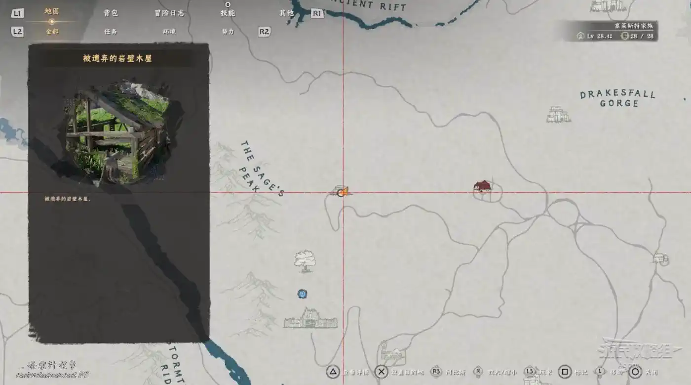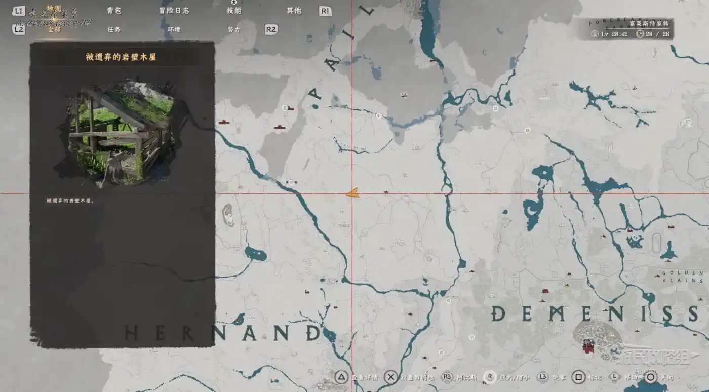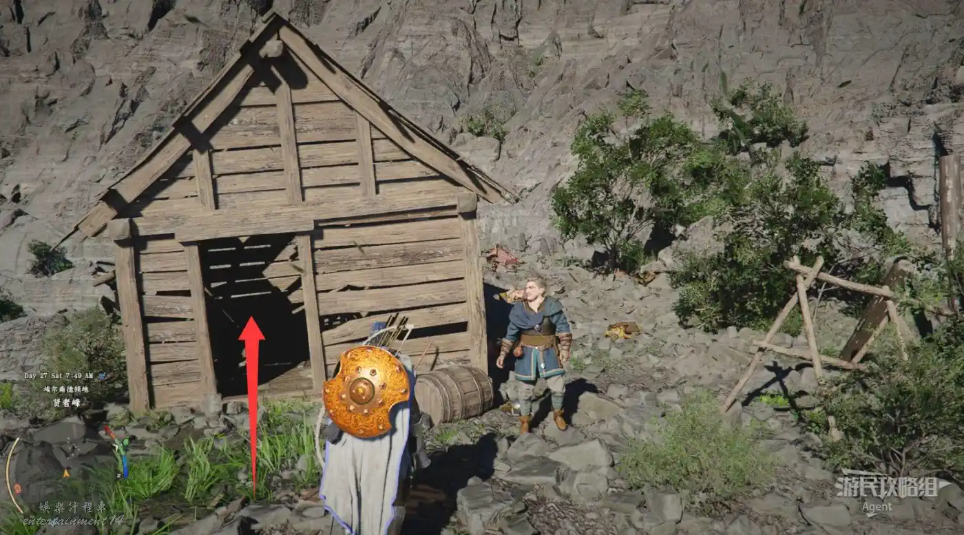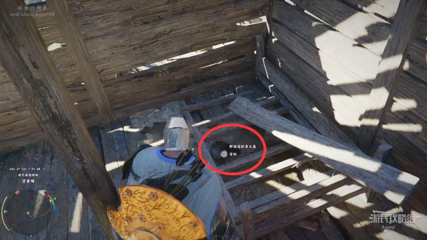 在埃爾南德東北,下圖位置有個被遺棄的岩壁木屋,在木屋裡拿到【野狼追蹤者頭盔】。