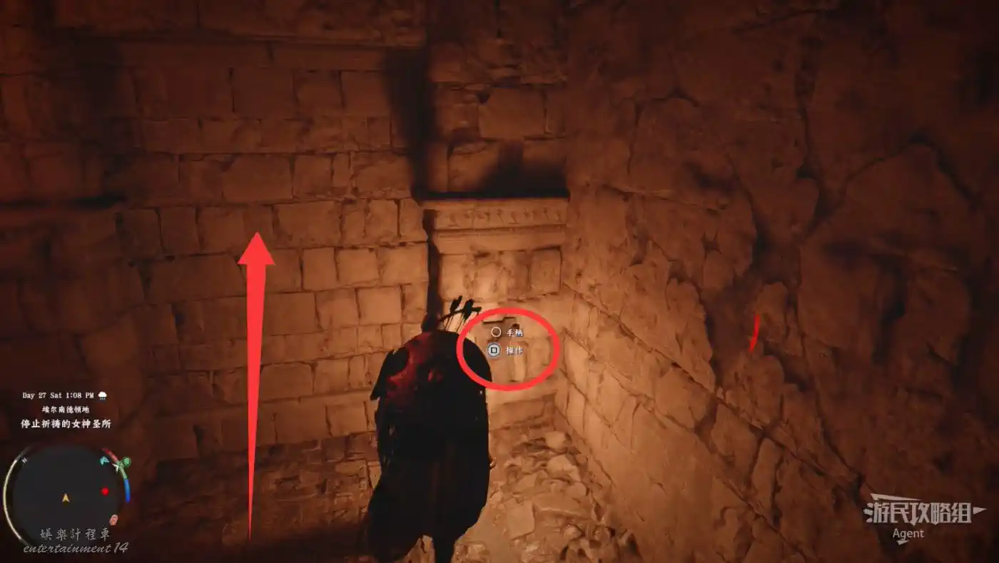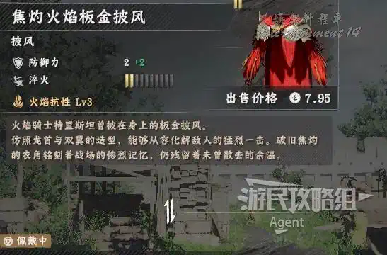 爬到右上角的牆壁處(最好靠邊一些),按螢幕右下角的“堅守”提示,抓住牆壁,然後使用勁法就能進入牆壁裡面,開寶箱拿到【焦灼火焰板金披風】。
