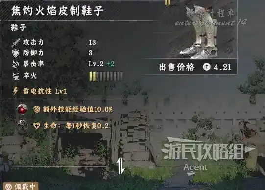 在埃爾南德東面,下圖位置的瀑布後面,從左側高處平臺用刺擊進洞,開寶箱拿到【焦灼火焰皮制鞋子】。
