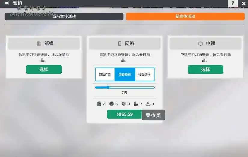 行銷值需要玩家購買宣傳活動後才能提升,共有紙媒,網路,電視三類行銷活動,每類行銷活動下還會細分三種,每種行銷對於商品的行銷提升不同。