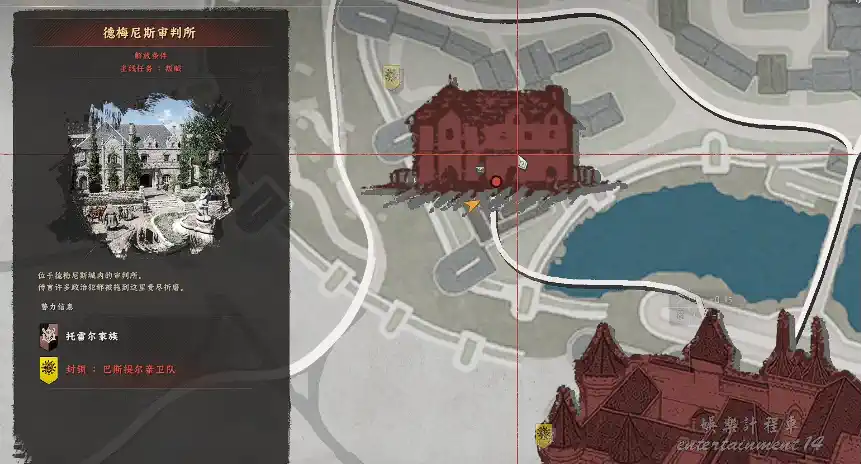 出城往西南方向(不是東南),找到南部審判所庭院(地圖標識:審判所/法院建築,不是馬戲團)