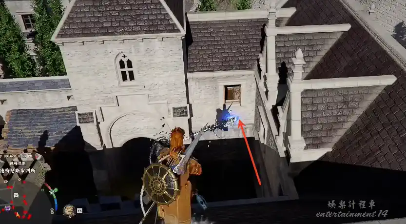 從屋頂平台,跳到對面二樓的外窗位置(窗戶可直接翻入,無需破拆)
