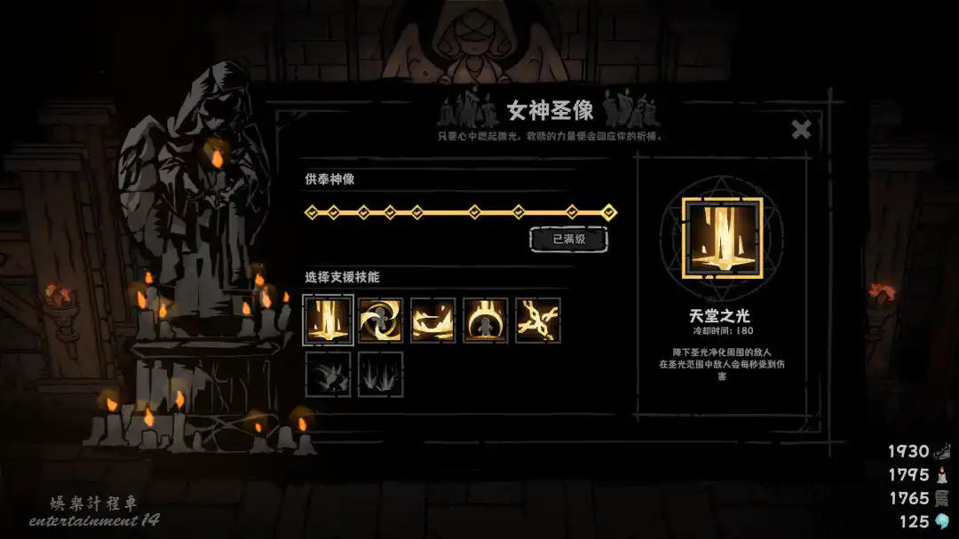 女神聖像在遊戲大廳(營地),需要先解鎖建造,才能學習純潔聖盾等支援技能。