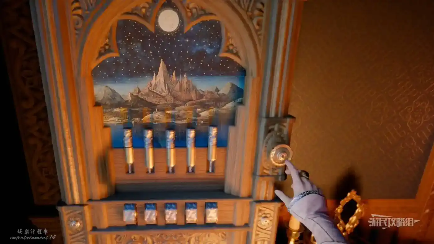 旋轉旋鈕打開保險箱,建議用鍵盤操作,將每個金屬柱中間的分界線與畫底部的線對齊,旋轉盤調整的是上方金屬柱的重量,向上轉是更重,向下轉是更輕,每次調整都需要按下最右側的按鈕才能檢驗當前的調整結果。
