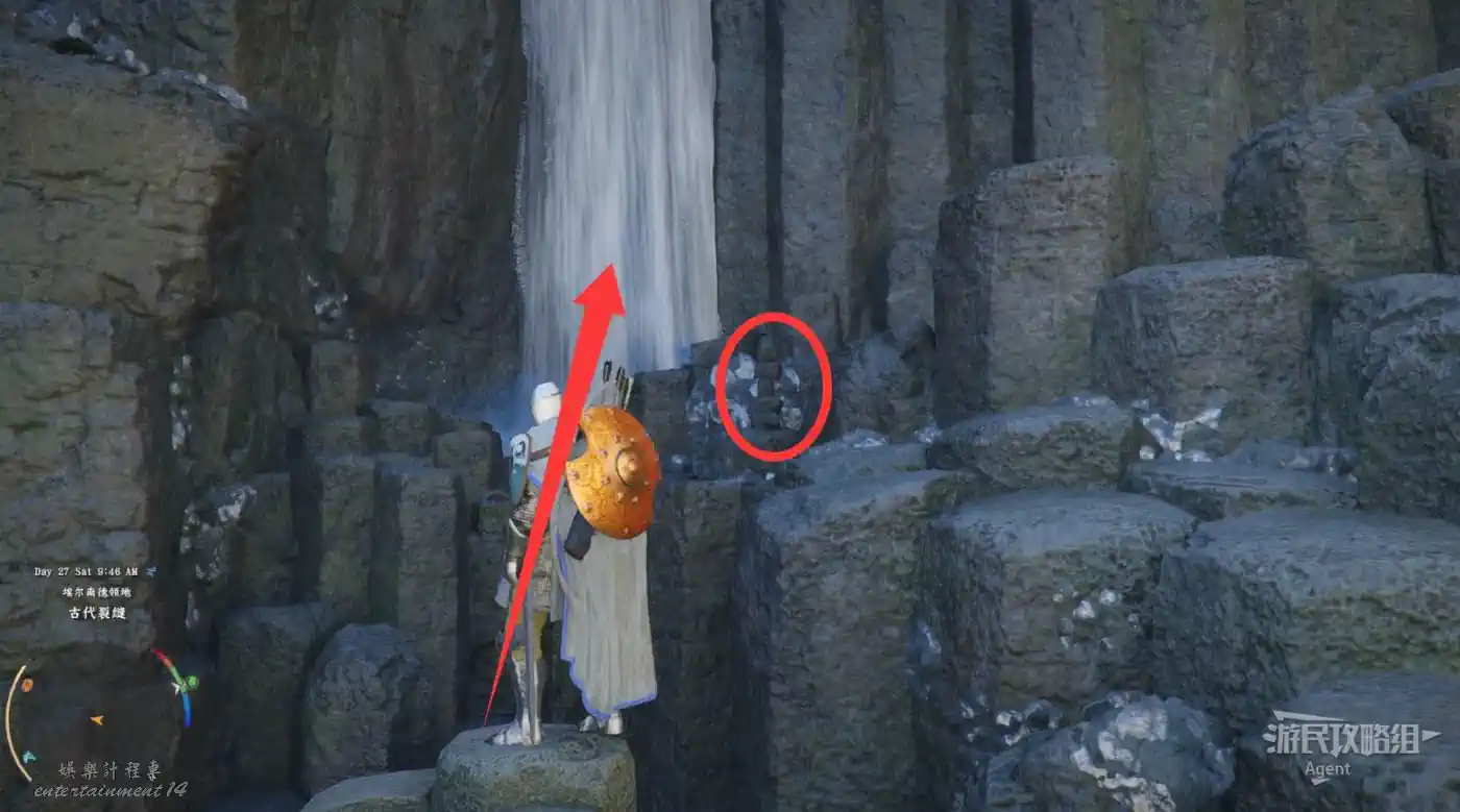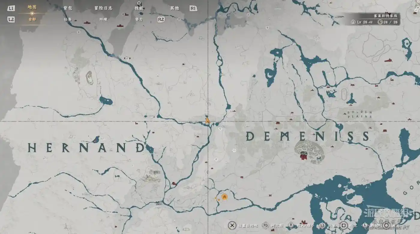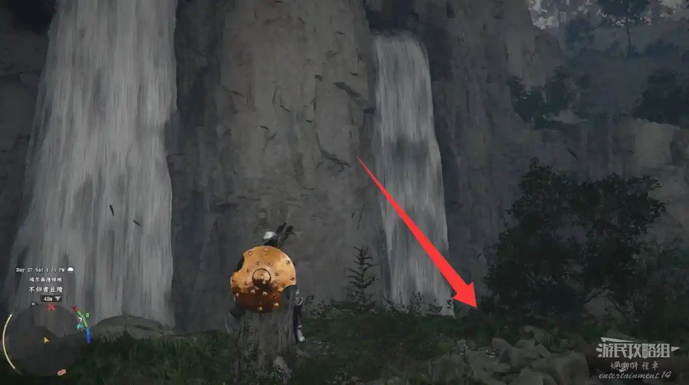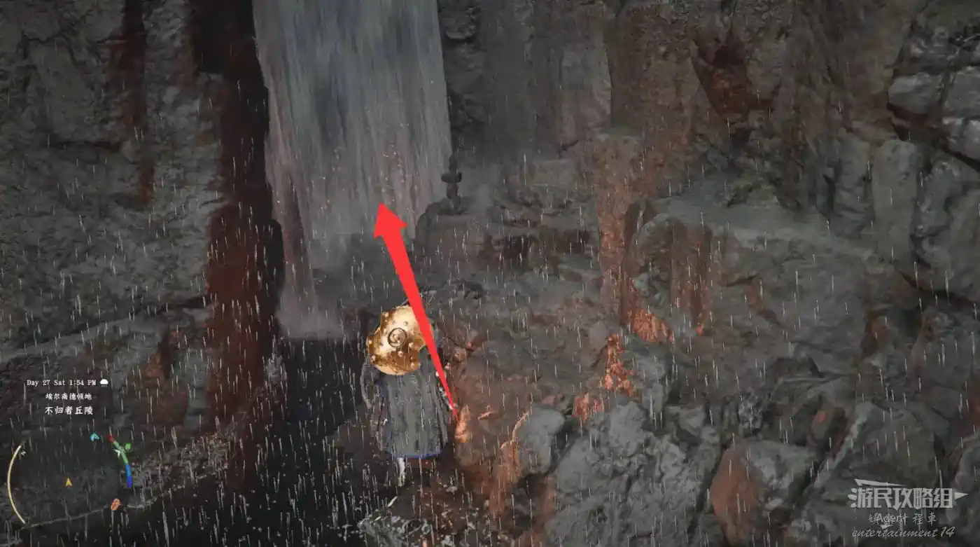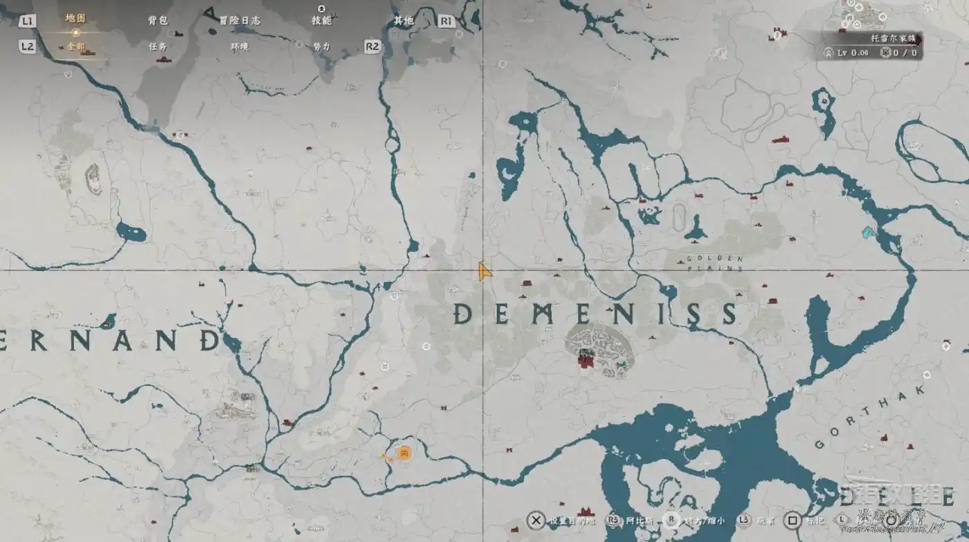 在大地圖最東面(德梅尼斯區域東面,黃金甲套裝各個部件都在這塊附近),下圖位置有個瀑布。