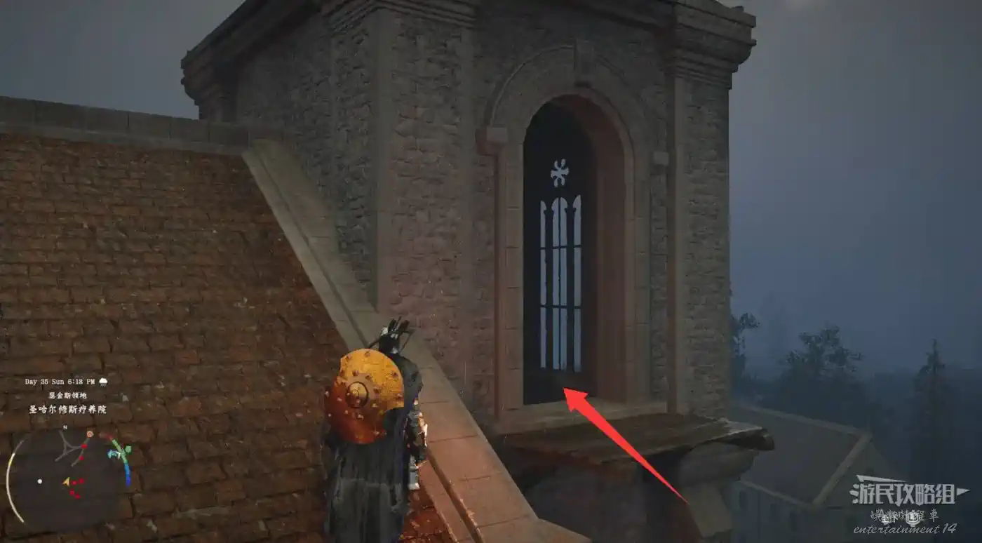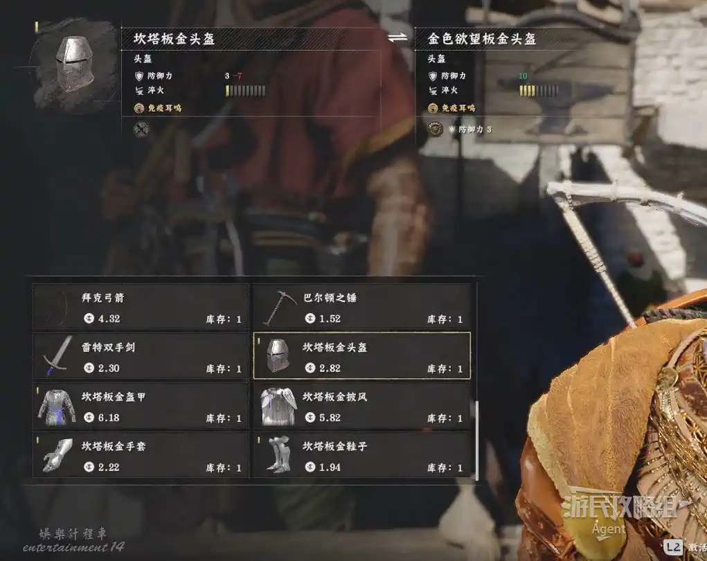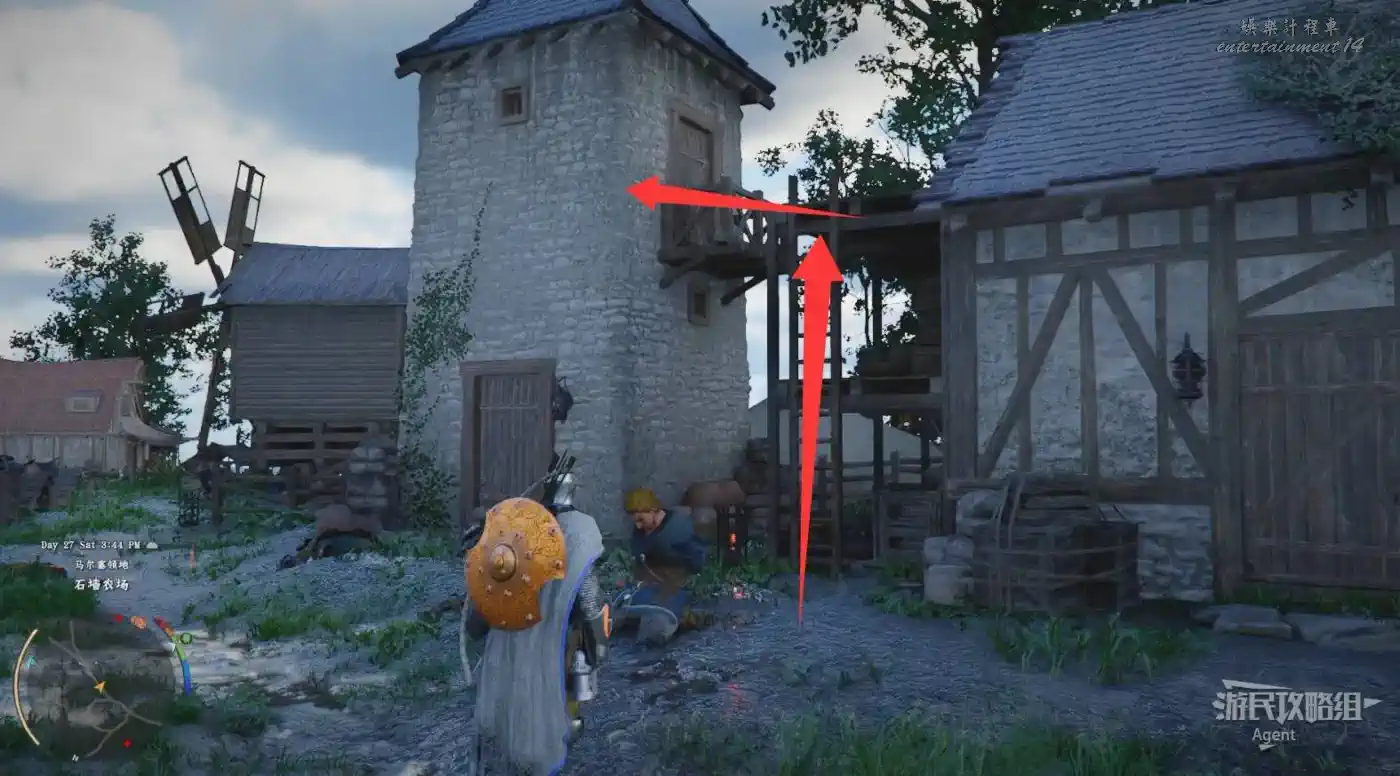 在埃爾南德東面(德梅尼斯附近),石牆農場下圖位置的谷倉裡,爬到上面開門(慢點進門,掉下去得重新爬),拿到寶箱裡的【焦灼火焰板金頭盔】。