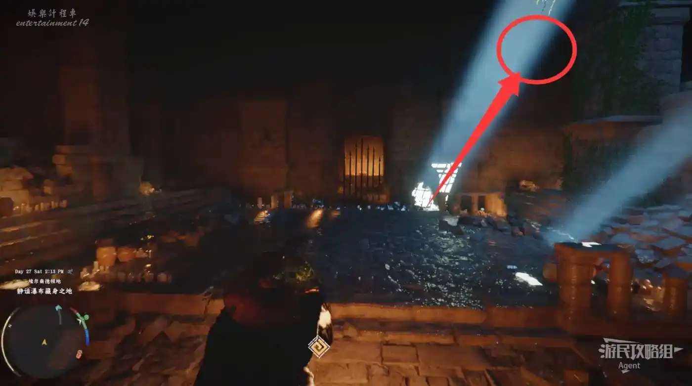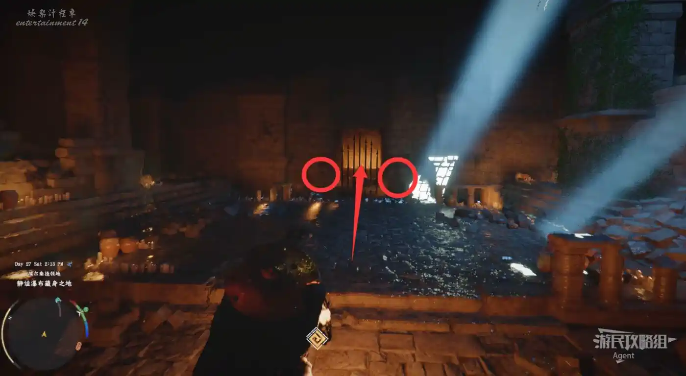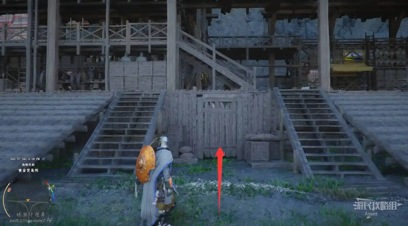 下圖位置有個階梯,進入階梯旁的洞,站在牆上的機關前,對牆上的機關使用勁法可穿過牆壁到裡面的隱藏空間,開寶箱拿到【金色慾望板金盔甲】。