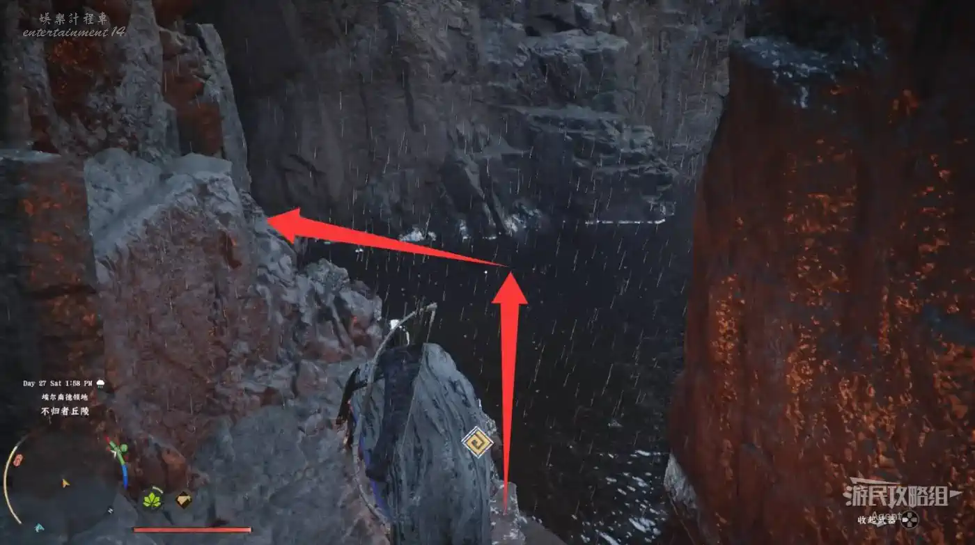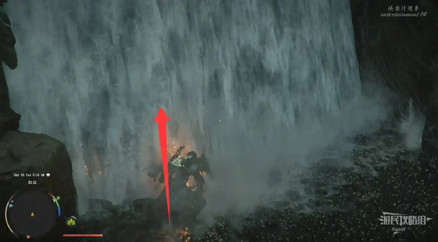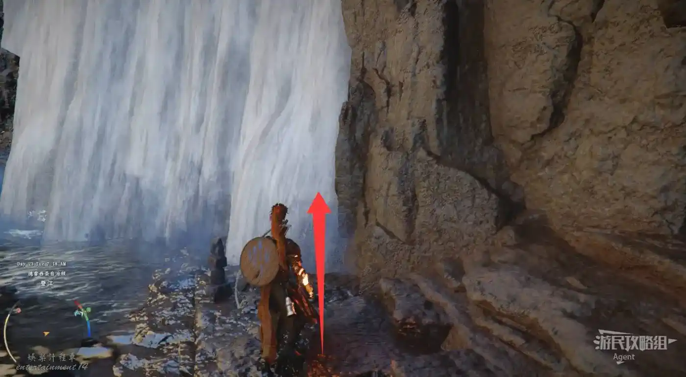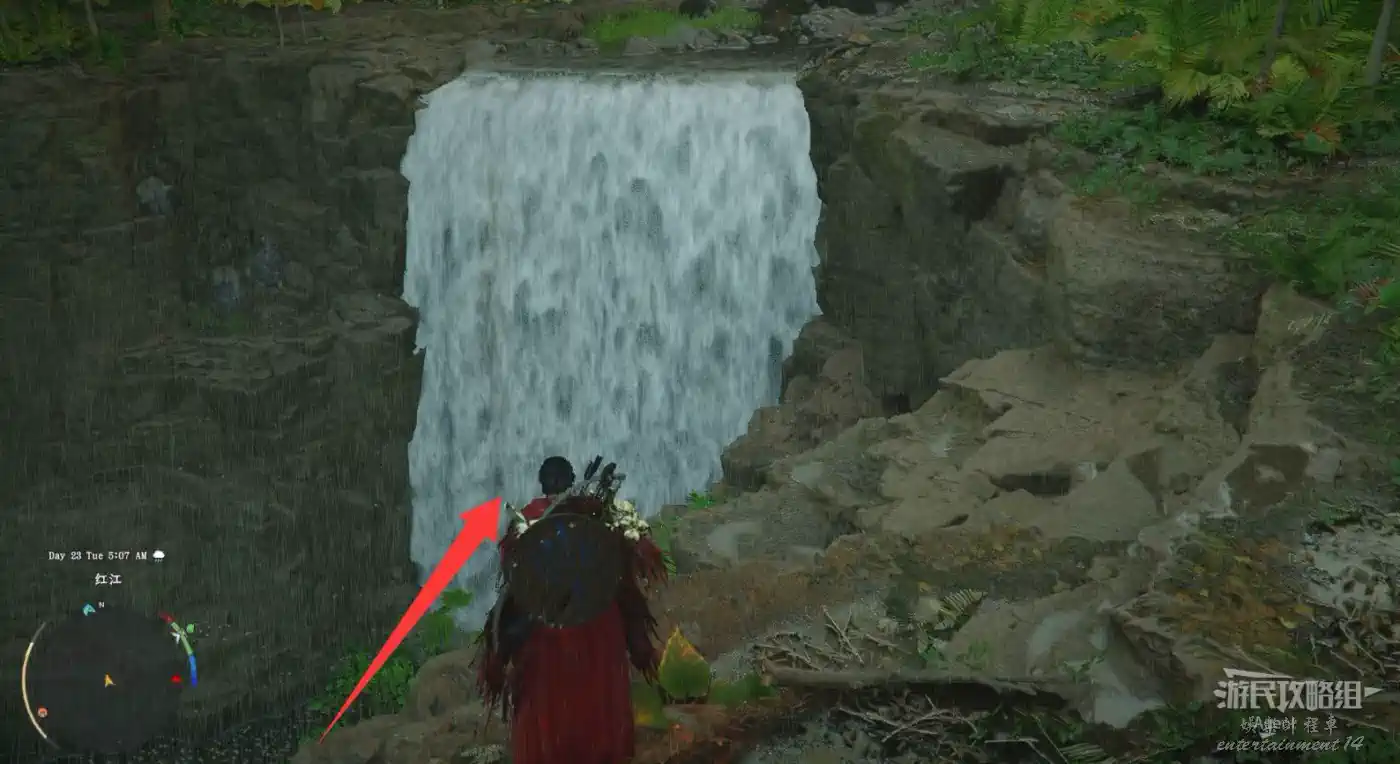 見到瀑布外有摞起來的石頭標記,就代表瀑布後面有隱藏洞窟,裡面往往能拿到套裝的裝備。用“刺擊”才能進入瀑布後面的洞窟。