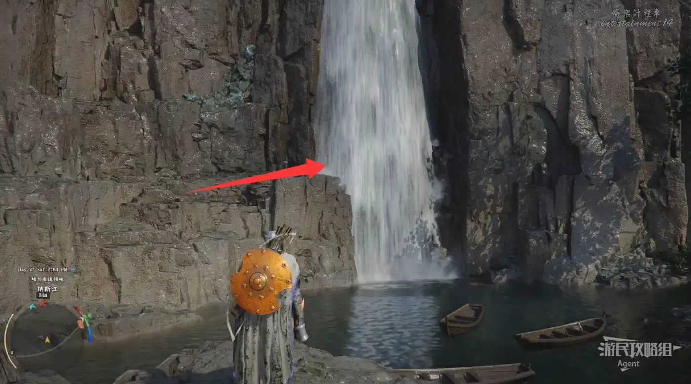 在埃爾南德東面,下圖位置有兩個瀑布,跳到下面,用刺擊進入右邊瀑布後面的洞窟,開寶箱拿到【焦灼火焰板金手套】。