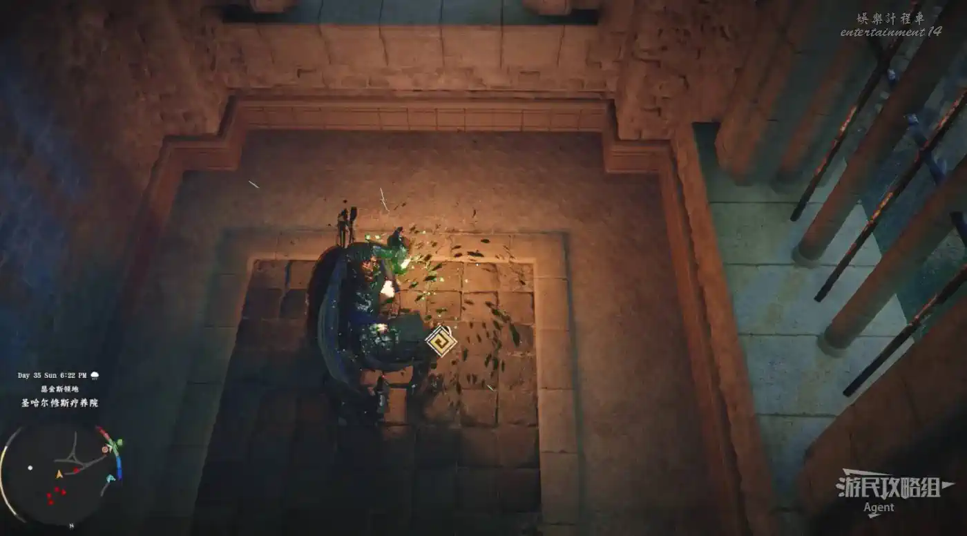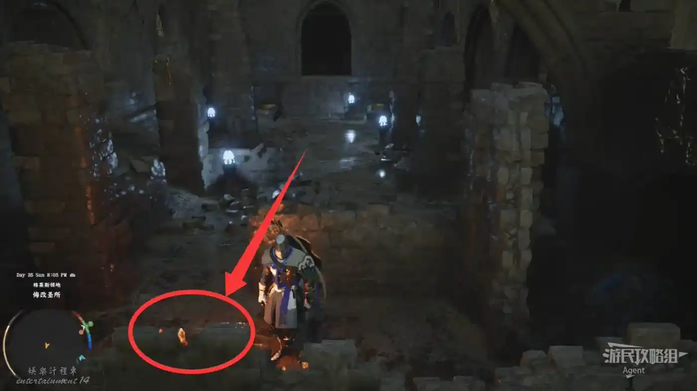 在埃爾南德東南下圖位置,找到門口兩側有兩個黃金棺材的地方,朝著門朝向的方向走,觸碰地板地板會破個洞,跳下洞去開寶箱拿到【黑翼皮制手套】。