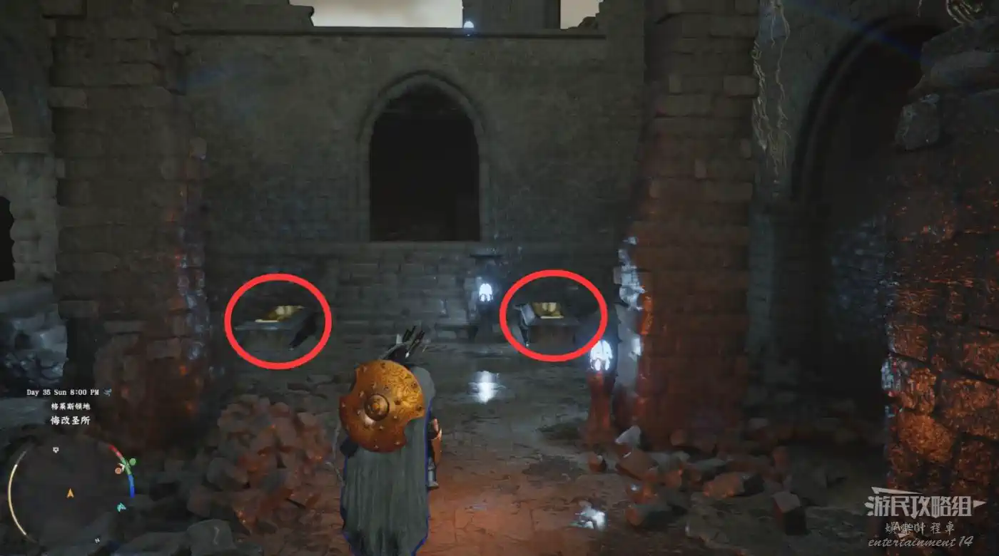 在大地圖最東面(德梅尼斯區域東面),下圖位置有個條約聖所,點燃兩個燈座,進去開寶箱拿到【金色慾望板金頭盔】。