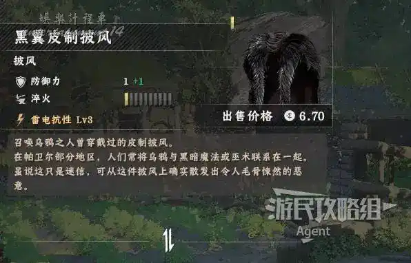 完成任務後進入福羅林村,在下圖位置砍碎房子後面的木板,開寶箱拿到【黑翼皮制披風】。