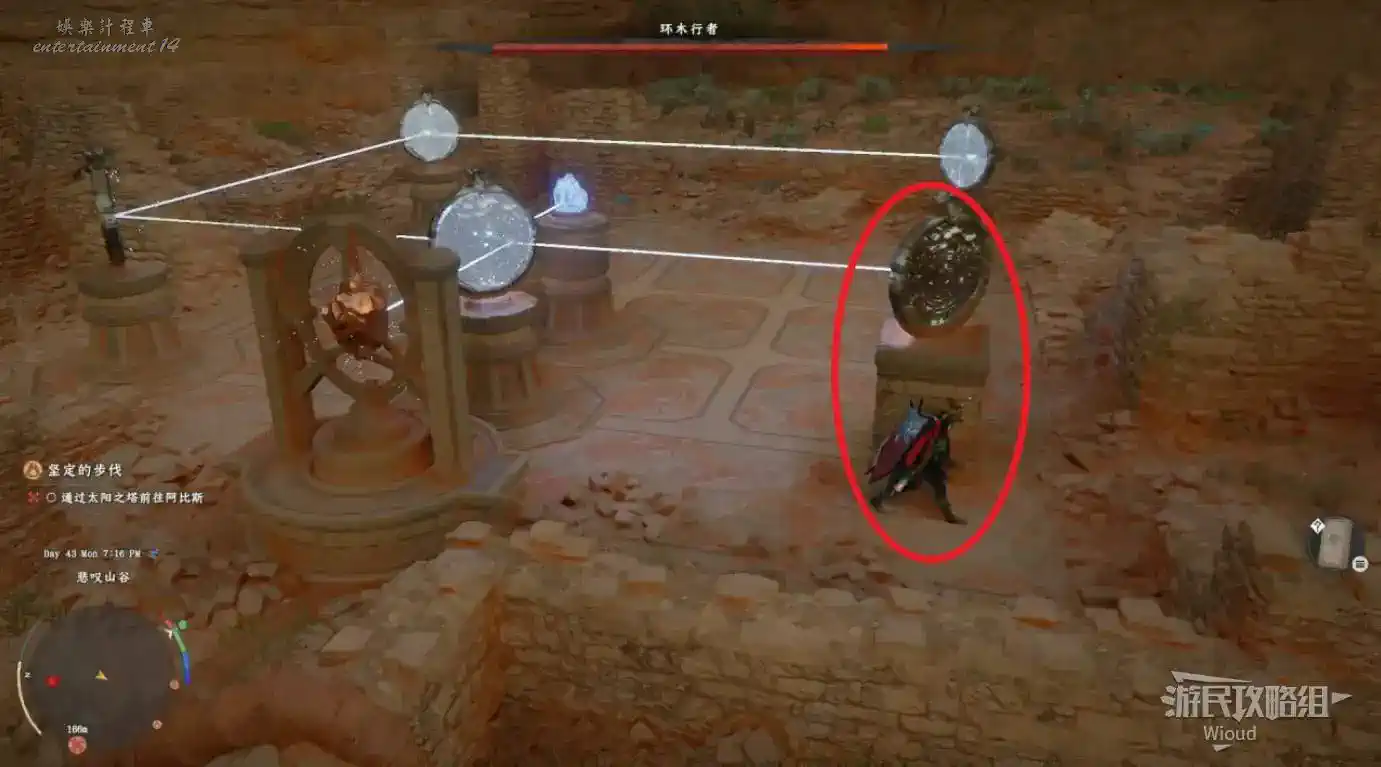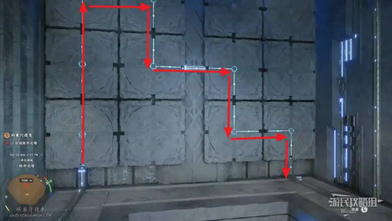 向左拖動牆上的石盤,使能量從左到右貫通過去,這個解謎很簡單,旋轉石板就行。