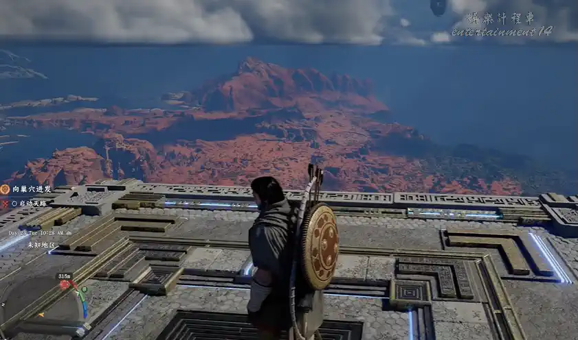 視角轉向右側山崖下方,找到可滑翔 / 跳下的平台