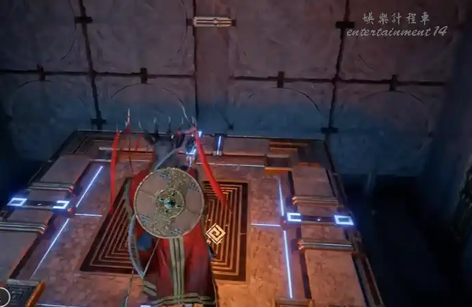 用勁法抓大轉盤外緣順時針轉180°,對齊上下左右能量線,轉盤發光。