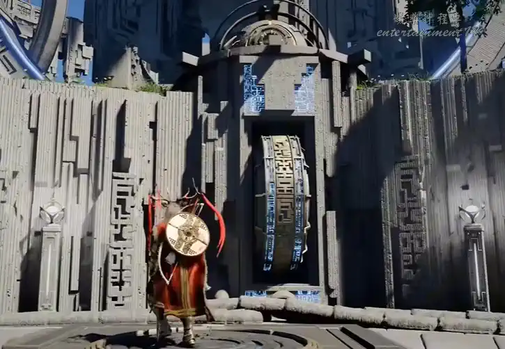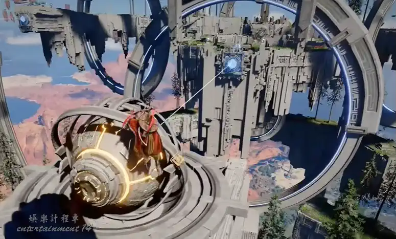 平台停穩後,三角傳送門前地面機關用勁法旋轉,啟動懸浮石板路;
