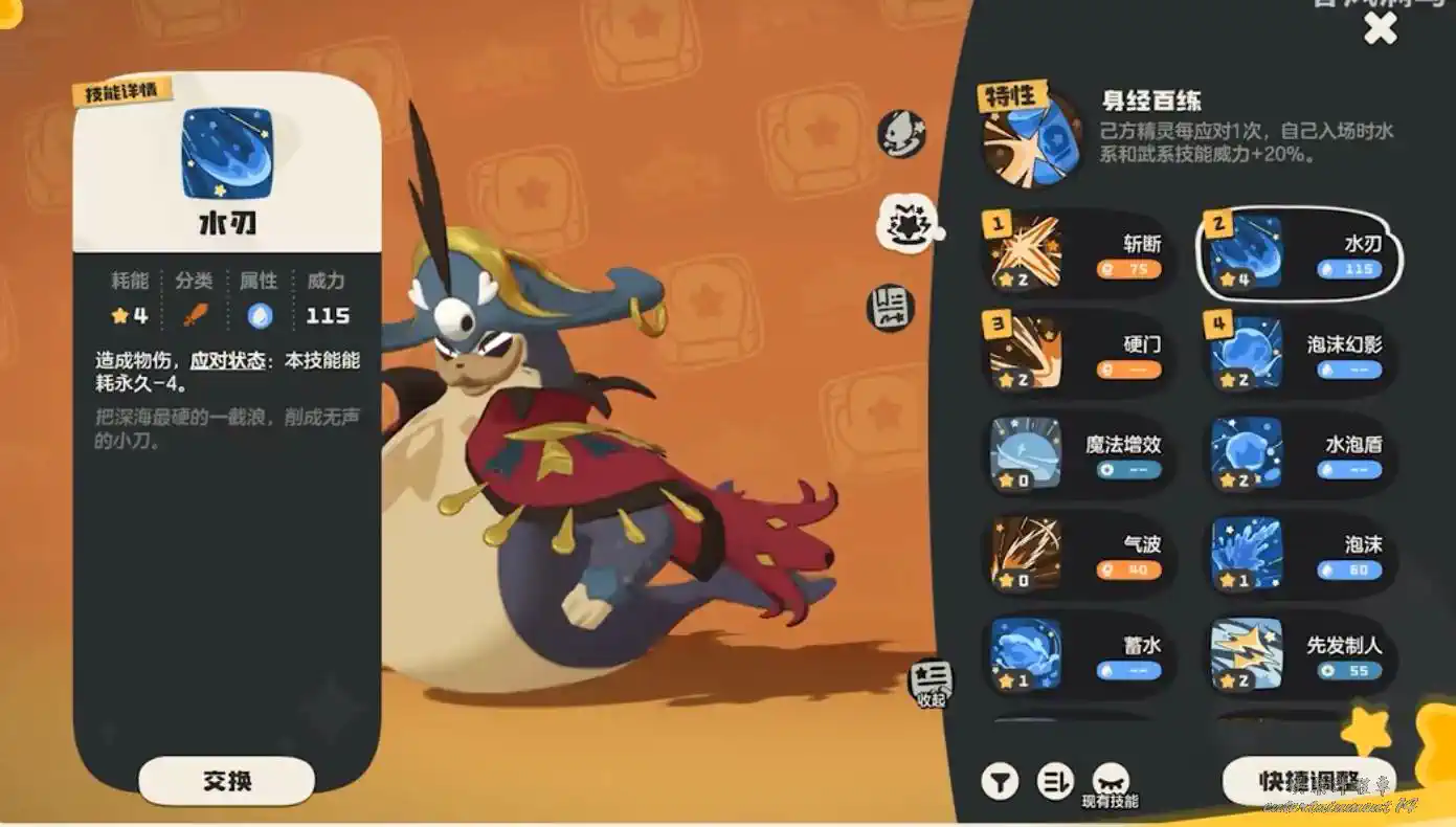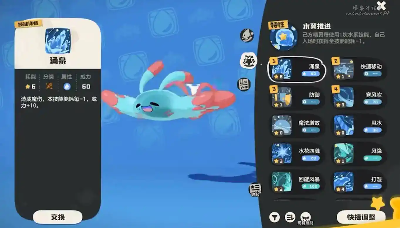 輸出選擇彩蝶鯊,技能方面推薦湧泉,搭配特性能夠有非常高的威力值,其他技能可選擇快速移動防禦與寒風吹增加弱點攻擊範圍。