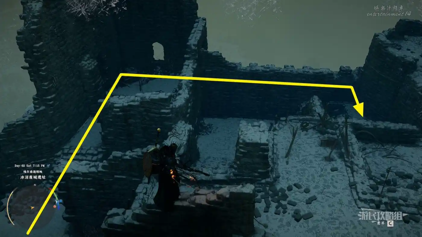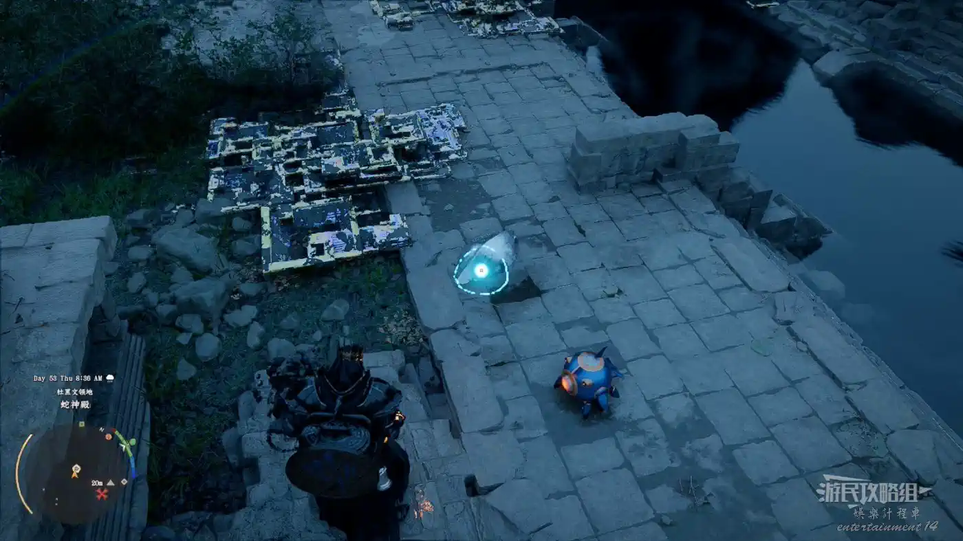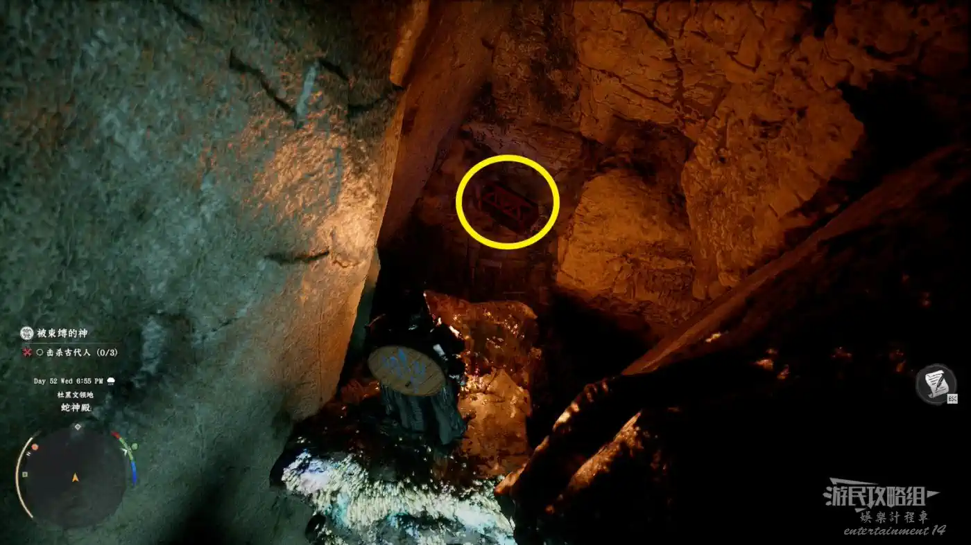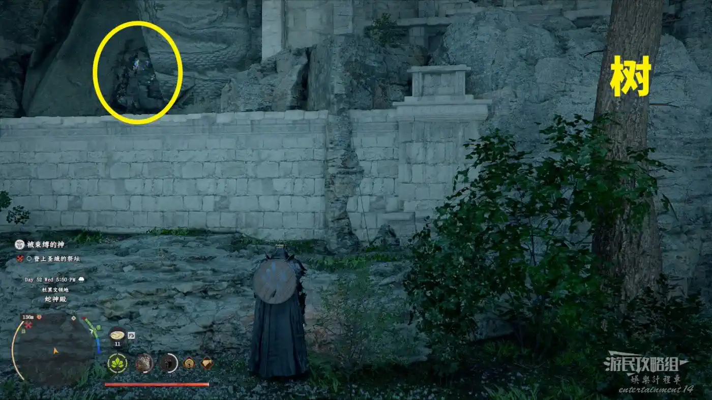 來到蛇神殿后會觸發古神的對話和勢力任務,制作古神武器不需要完成任務。參考下圖,往巨蛇神爬出位置右邊的廢墟處走(有個很顯眼的斜放的石柱)。