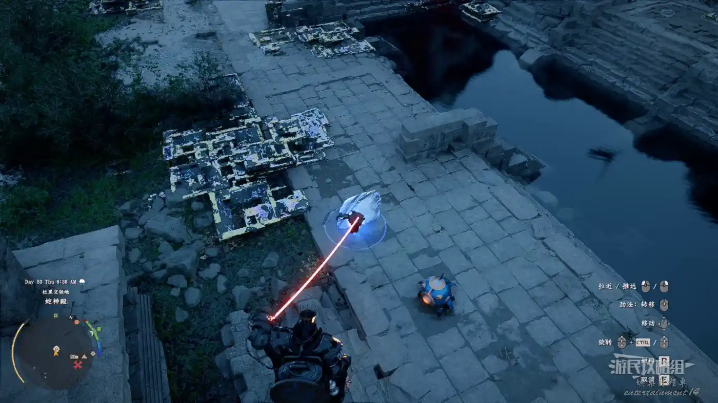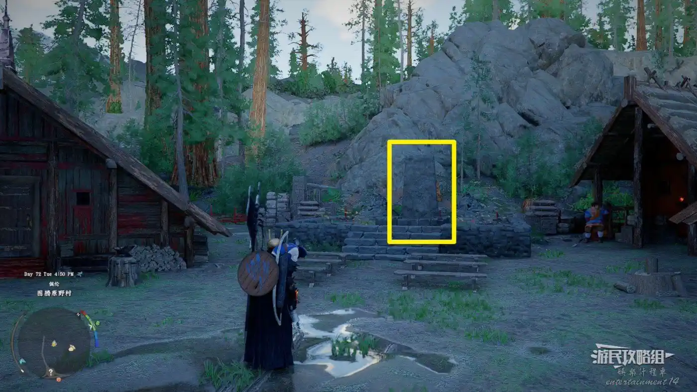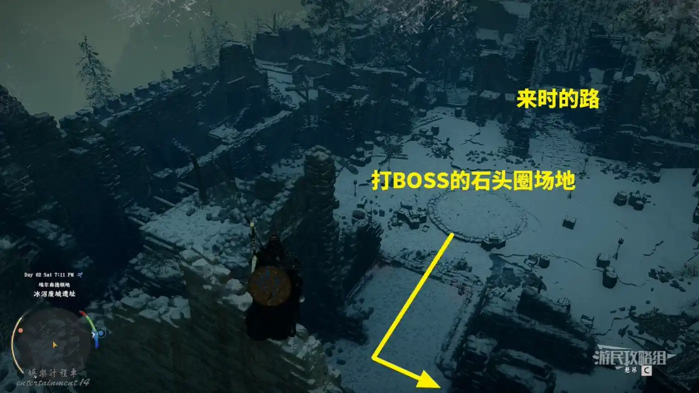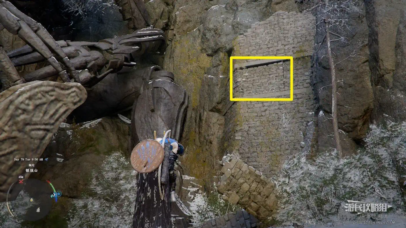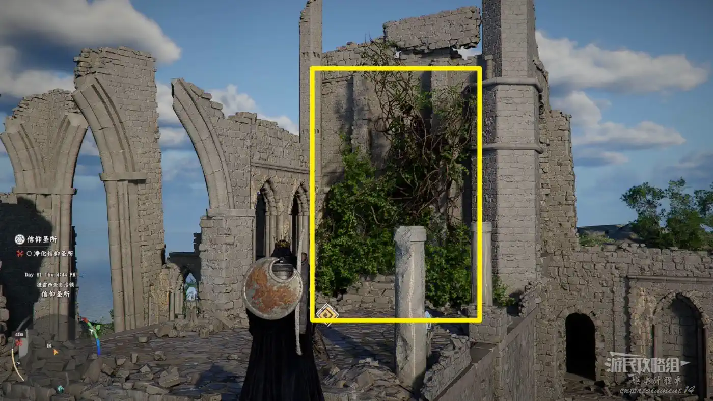 來到蛇神殿后會觸發古神的對話和勢力任務,制作古神武器不需要完成任務。參考下圖,往巨蛇神爬出位置右邊的廢墟處走(有個很顯眼的斜放的石柱)。