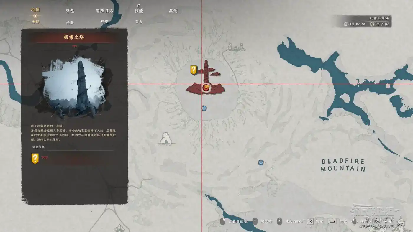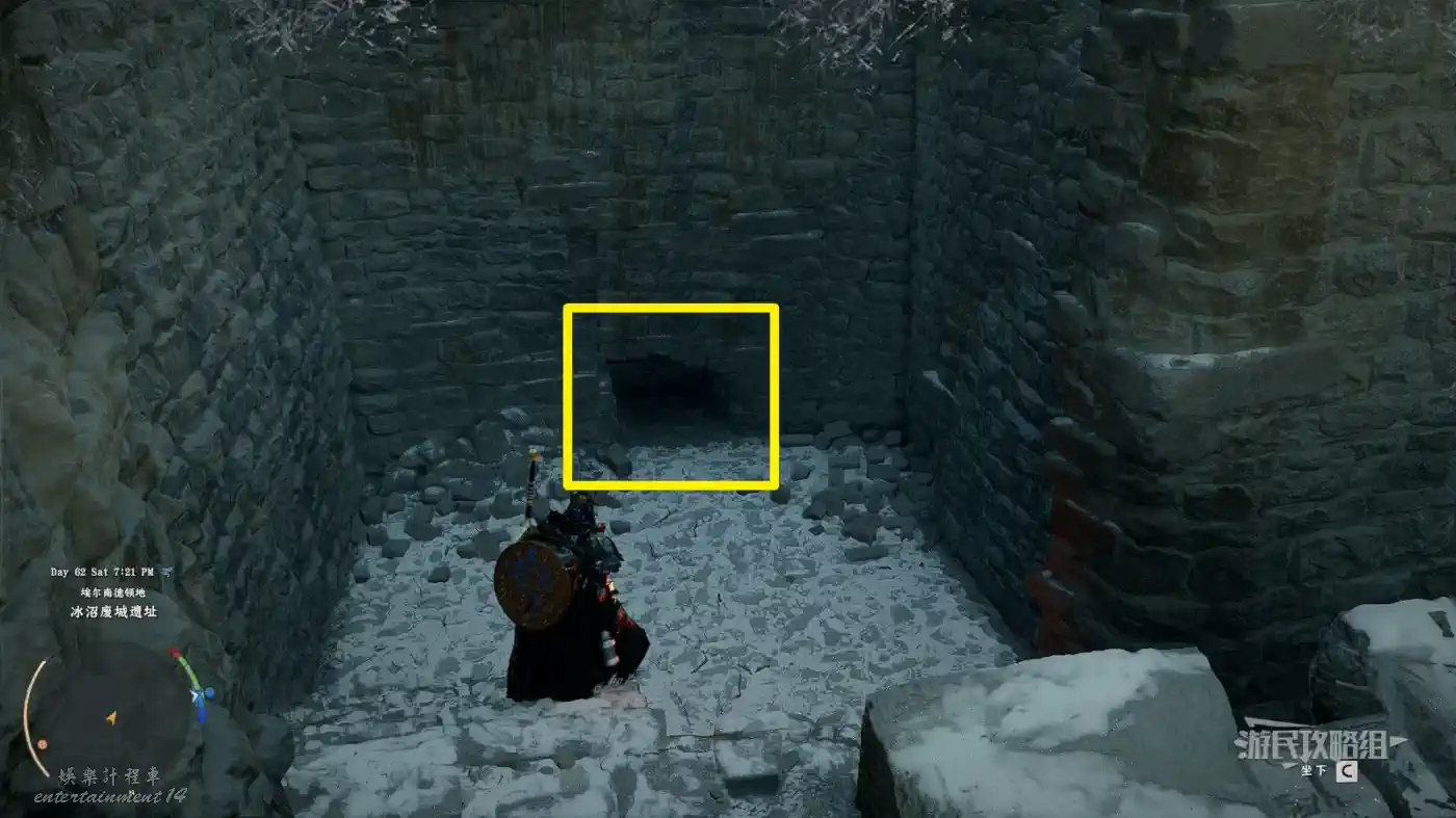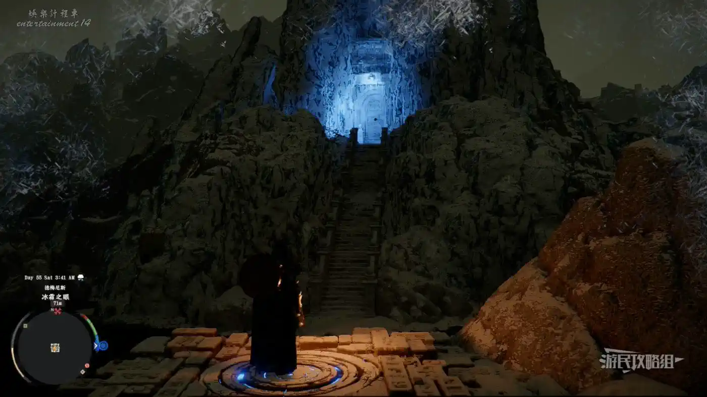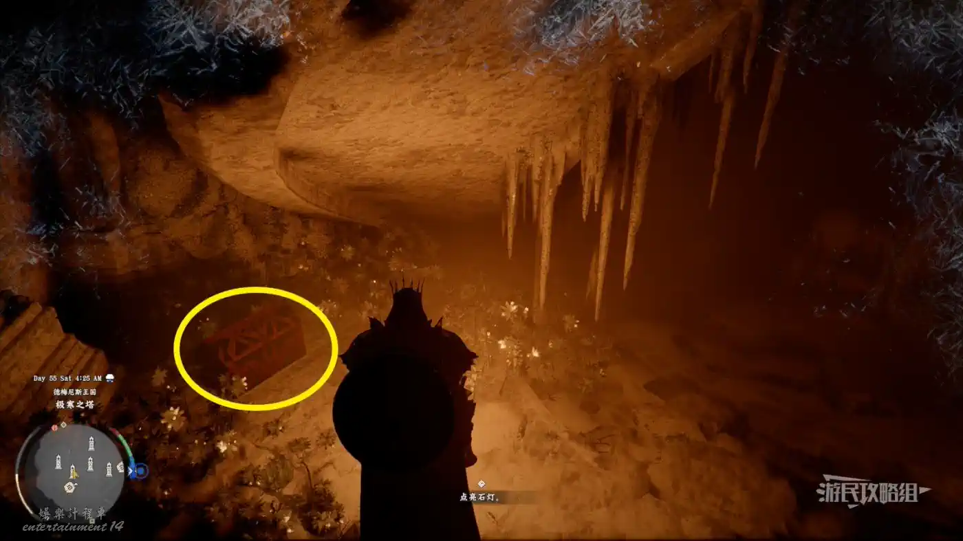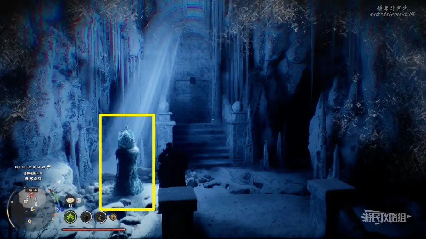 位於德梅尼斯最北端的極寒之塔中,正門樓梯上方入口的門上了鎖,需要先把門口燈籠結的冰打碎,方式不唯一,例如使用旋風斬(滑鼠左鍵+滑鼠左鍵/R1+R2),然後與其互動將其點亮即可開門。順便正門外的樓梯對面有個傳送點,可以順便開一下。