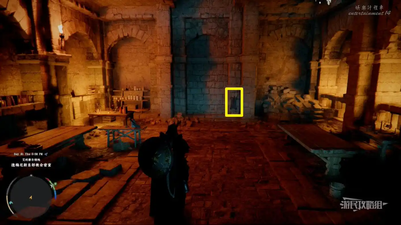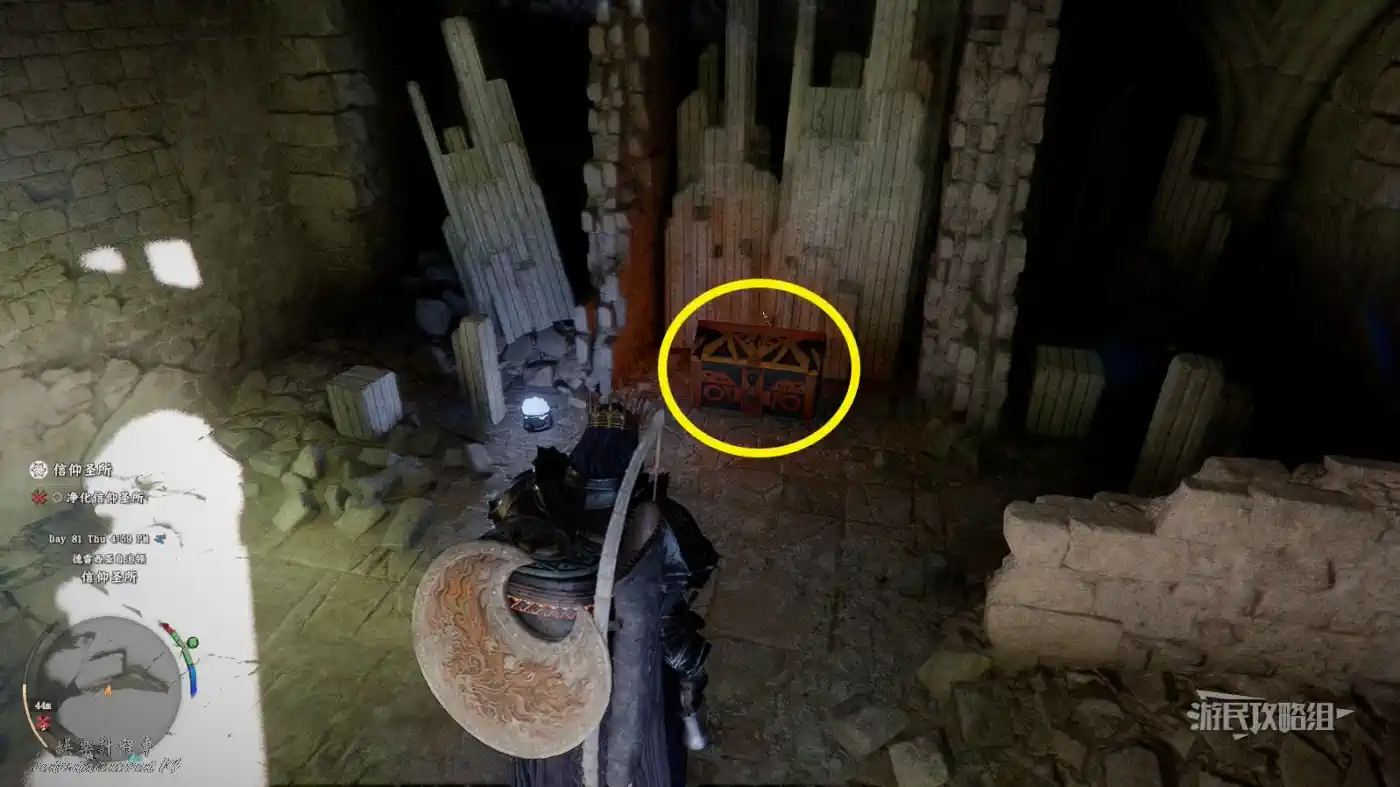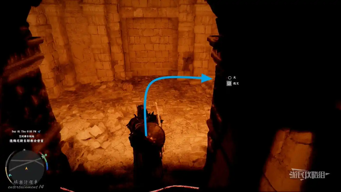 先在傳送點的位置做一個目標標記,然後從正門進入毀滅寺院,正對前方的椅子,跳入地上的坑到底層。