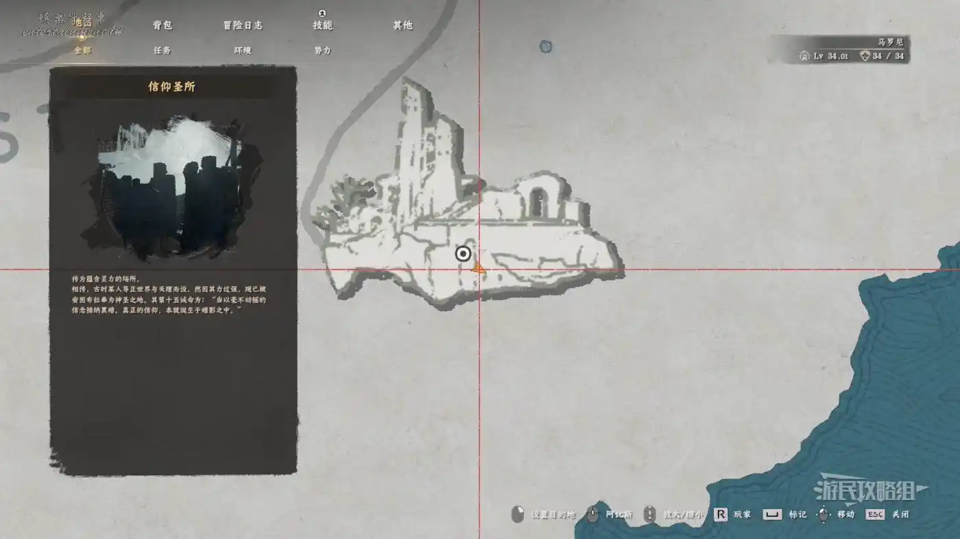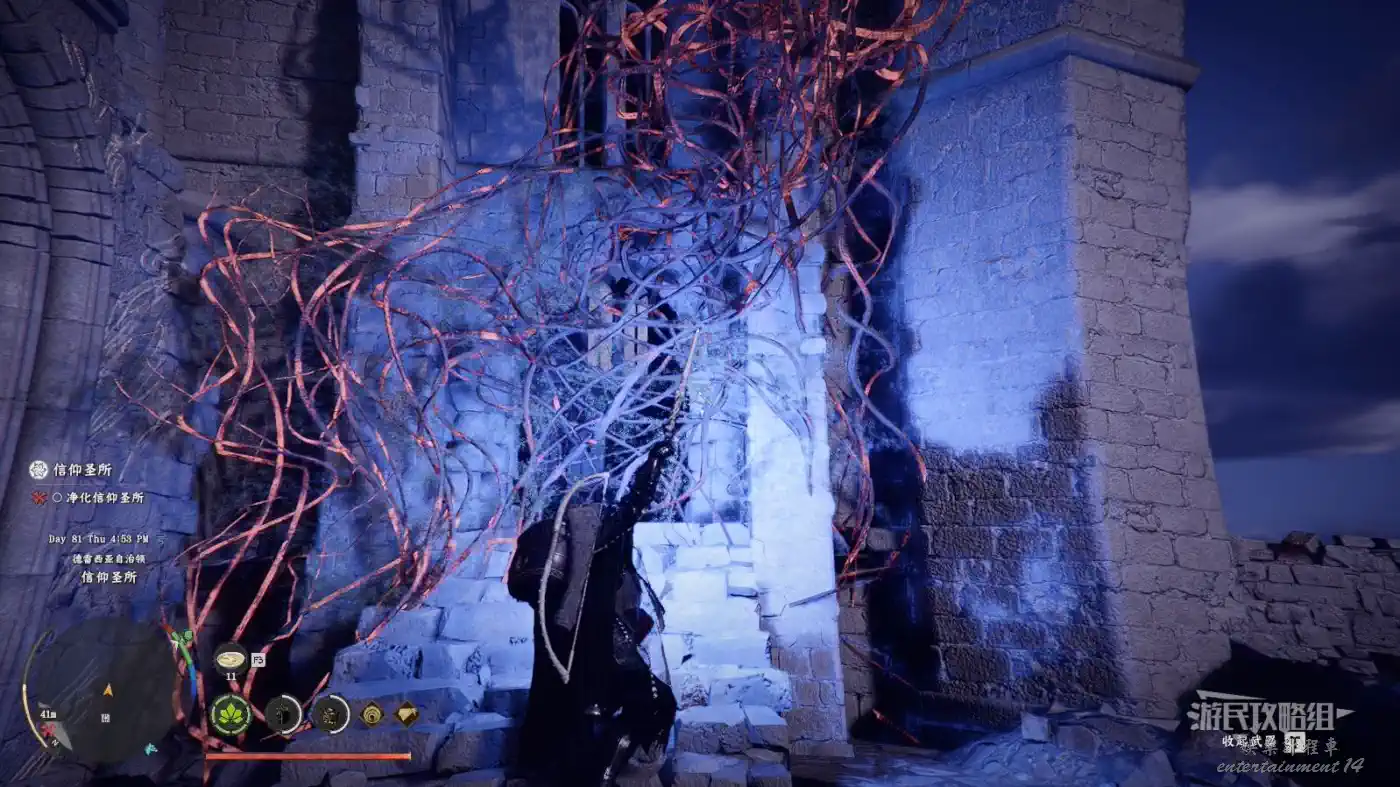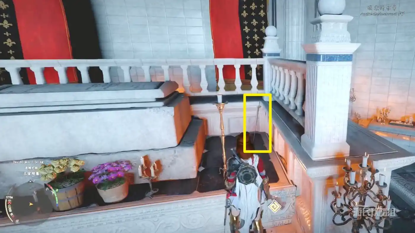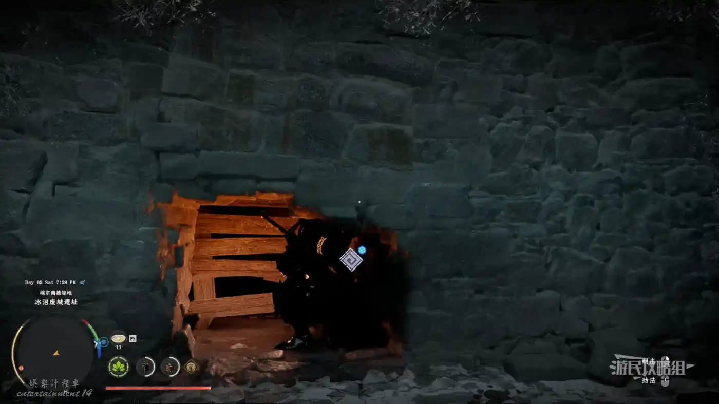 先在傳送點的位置做一個目標標記,然後從正門進入毀滅寺院,正對前方的椅子,跳入地上的坑到底層。