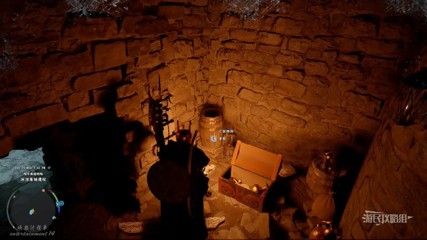 下樓之後可以看到淨化聖所需要找的方塊,方塊旁邊有個石燈籠,是燈籠是開房間正面尖刺機關的,點亮石燈籠,從旁邊的缺口進入房間,開啟寶箱即可獲得。