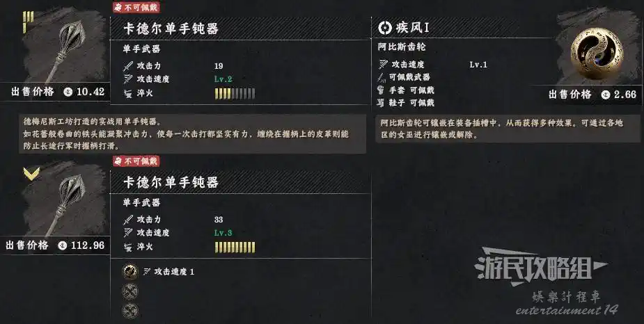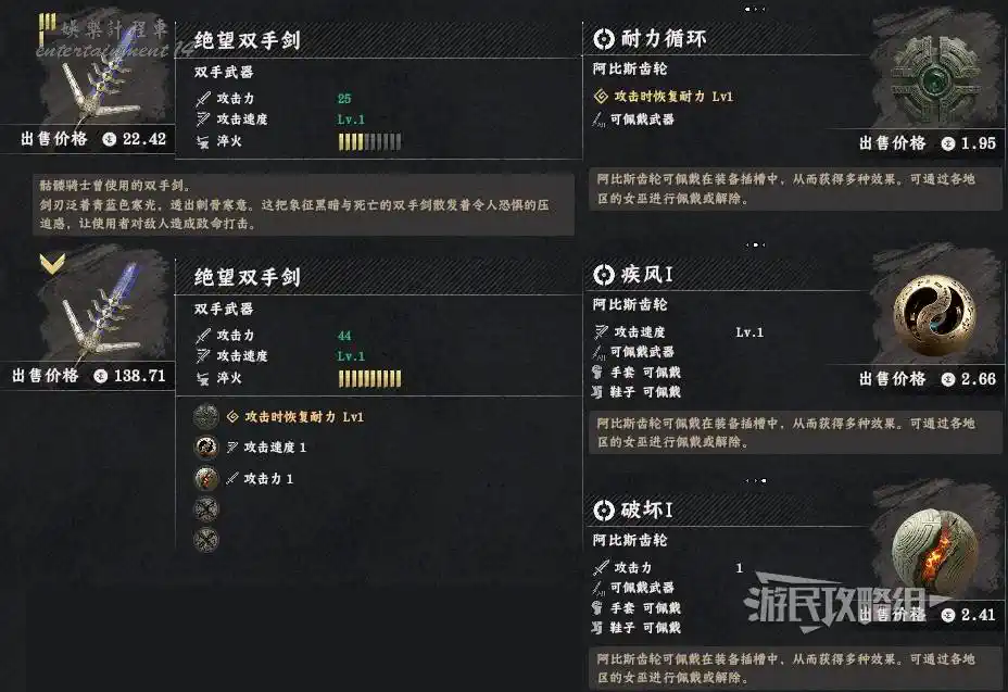 絕望雙手劍具有較高的基礎攻擊力數值,即使不在空欄位中鑲嵌增傷齒輪,也具有足夠可觀的傷害輸出;只可惜不自帶霜凍附魔。此武器可以在任何劇情階段獲得,只是因為極寒之塔區域的敵人很多,且很難對付,因此獲取的過程也頗具挑戰,不過真的很帥!值得一試!如果對武器自帶的齒輪效果不滿意,也可以找女巫替換。