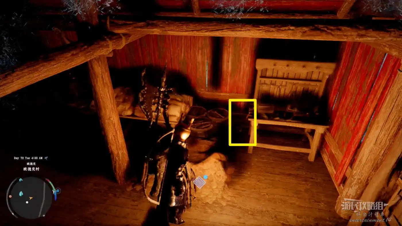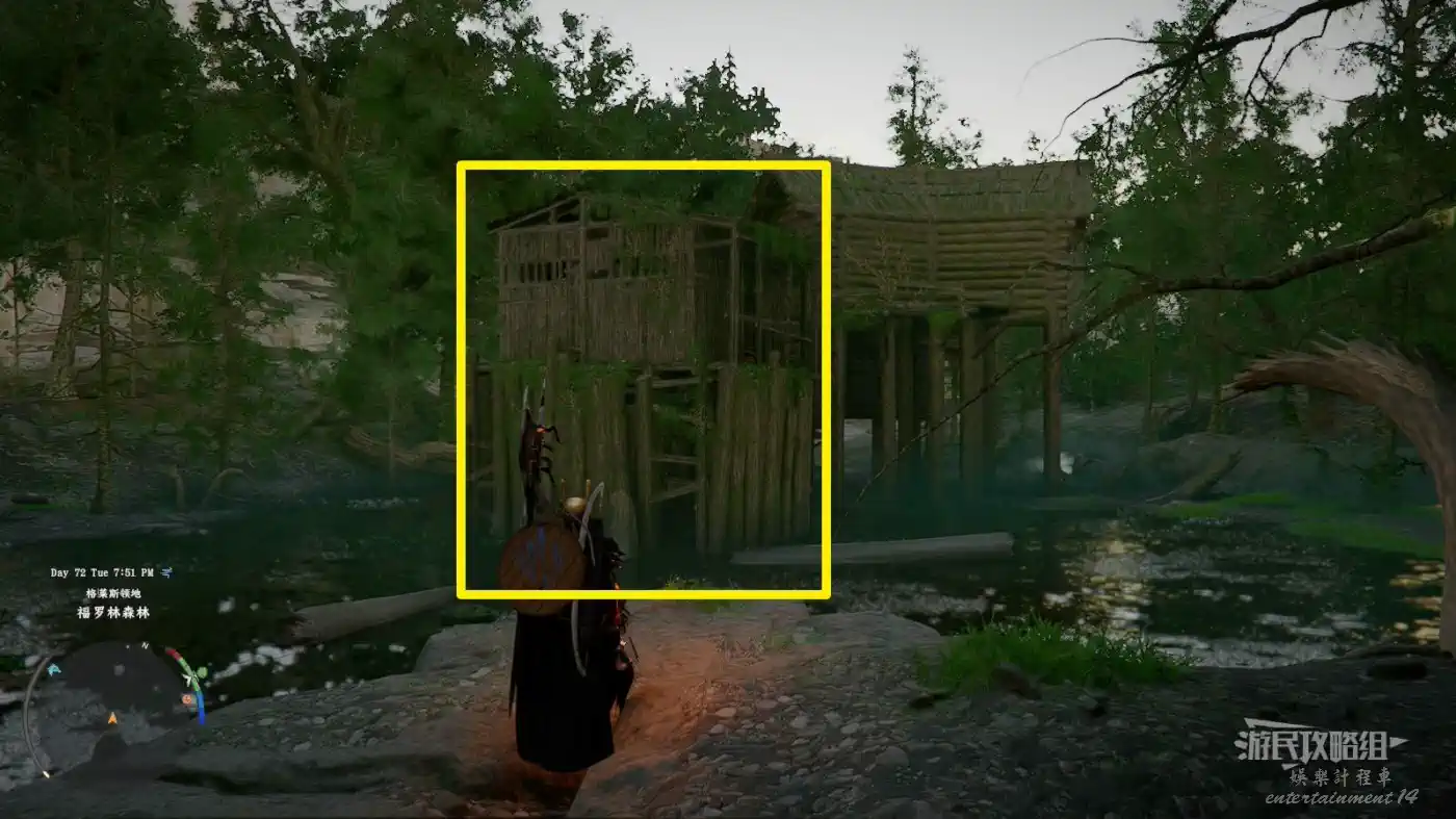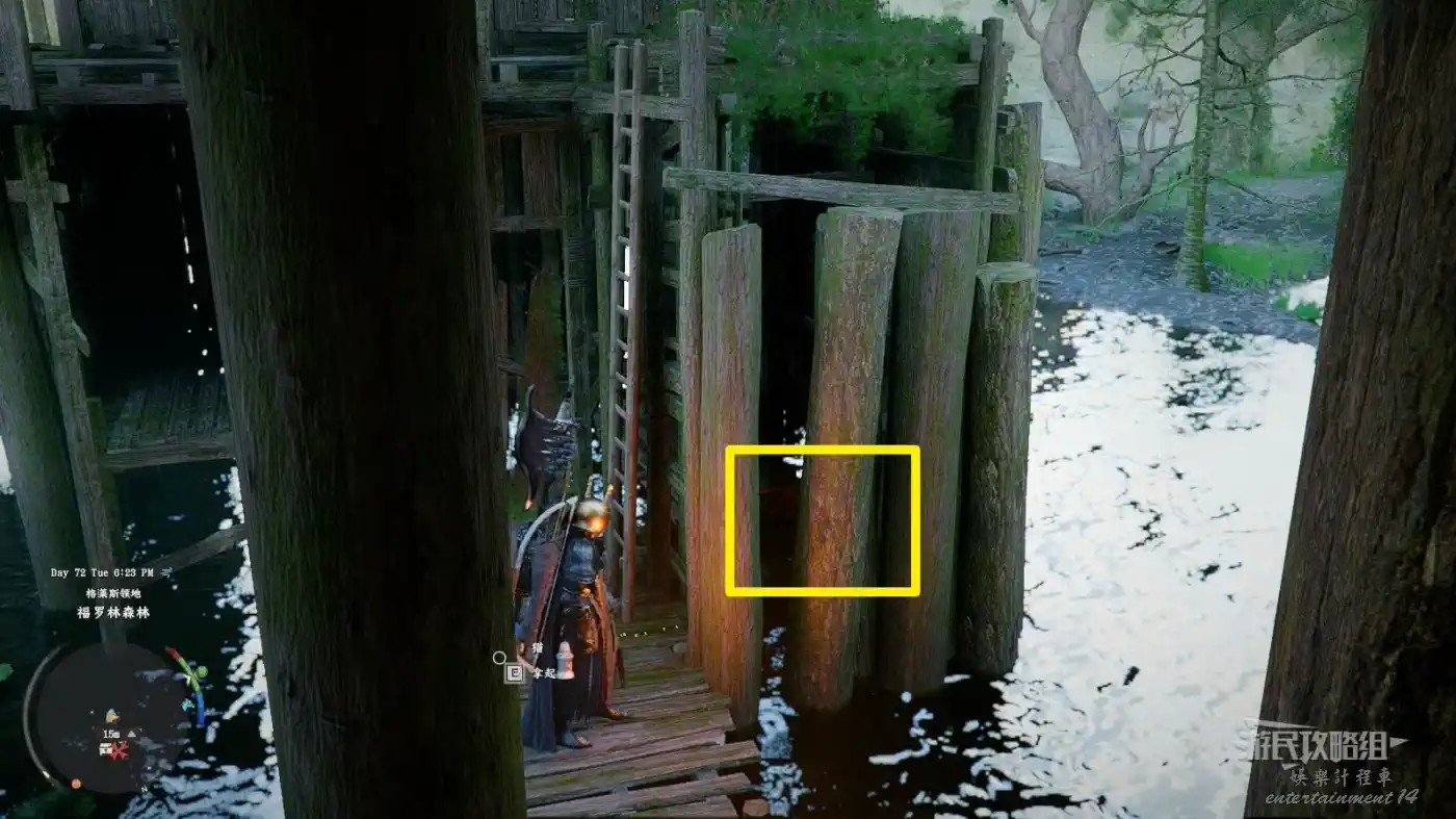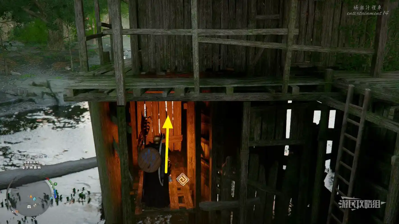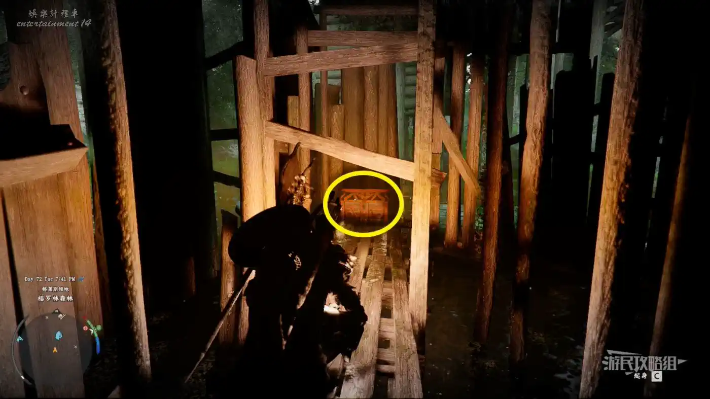 位於埃爾南德福羅林森林中的默德里奇木屋,在較小木屋下層的梯子旁邊可以看到寶箱,建議先把附近的怪清掉,沼澤進去會掉血,要儘快離開。寶箱就在梯子所在木牆裡面,不能直接過去,需要跳到梯子旁邊的木板上,下蹲穿過翻轉木板門,沿著木板往前走到頭即可開啟寶箱。