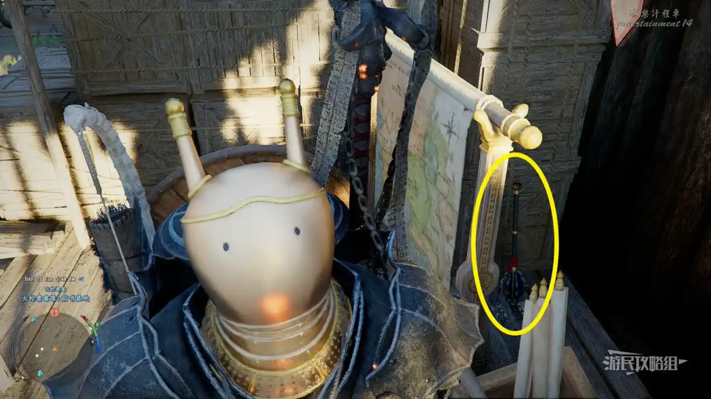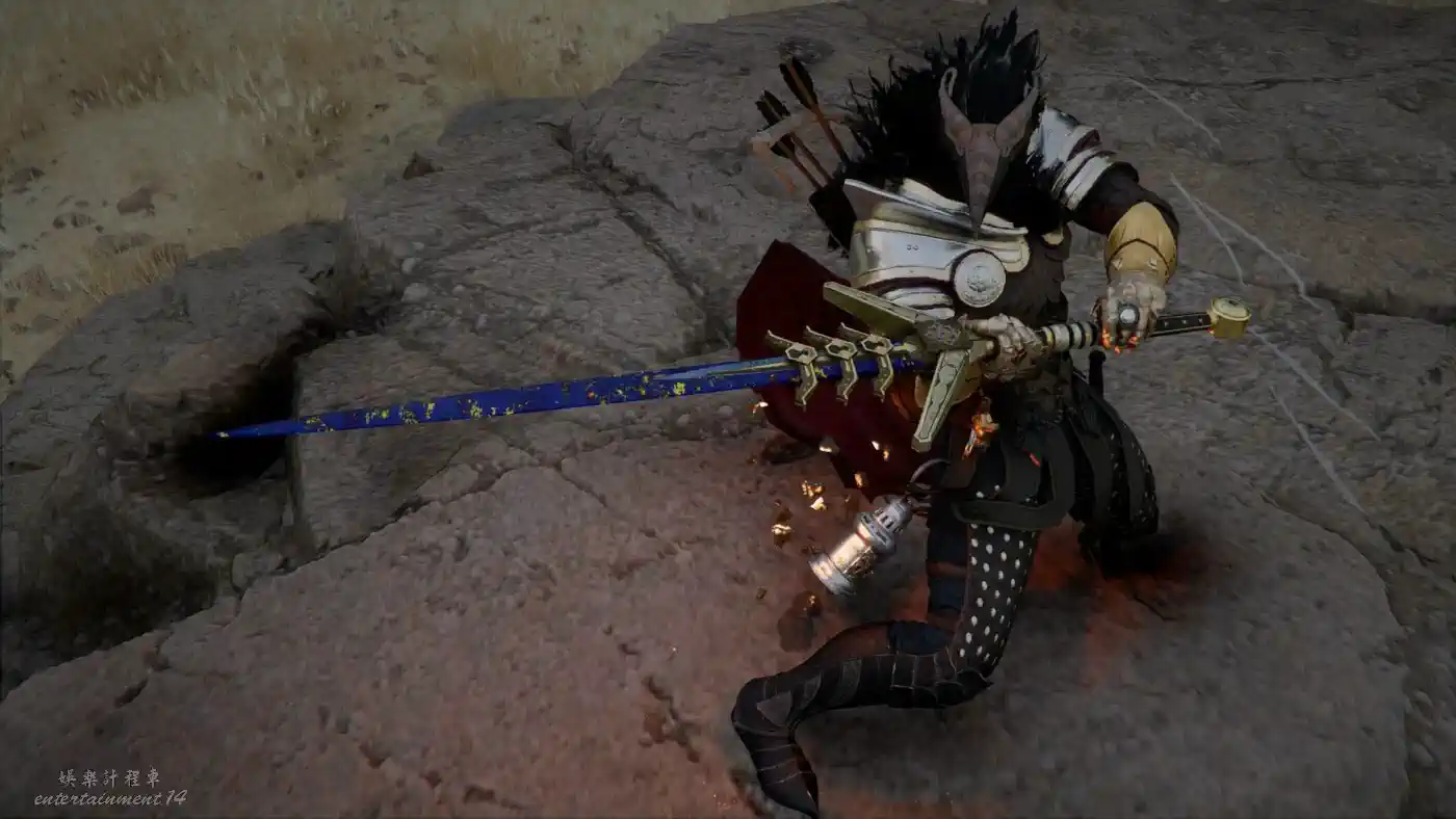 從正門進入遺址後往北走,可以看到地上有個石頭圈,這裡是勢力任務打BOSS 的地方,從石頭圈前方上樓梯,一直沿著樓梯往前走,中間不要往下跳,走到頭會來到一個被石頭牆圍住的小區域,正對樓梯的那面牆底部有個缺口。在缺口處下蹲(鍵盤C鍵/L3)用勁法(滑鼠中鍵/R3)打碎擋路的木板,進入房間可以看到一個寶箱,此武器就在寶箱旁邊。寶箱裡是失落王國套裝的披風。