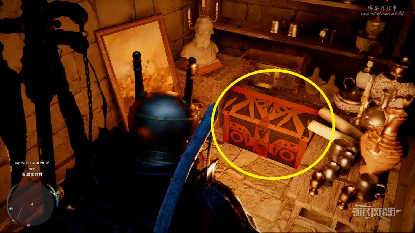 首先來到地圖上的德梅尼斯北部/佩倫東南部的斯特倫大宅頂層,從宅邸側面的窗戶翻進去,走門離開房間,在房間另一頭即可看到保險箱。